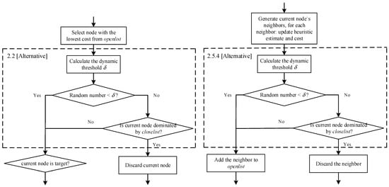 It may be noted that the standard MOA* algorithm directly performs dominance checks on the current node and its neighboring nodes during exploration. The dynamic probability-based pruning strategy proposed later uses the alternative steps. In Figure 2, the two boxes labeled 2.2 and 2.5.4 represent the standard steps of the MOA* algorithm. If the dynamic probability-based pruning strategy outlined in the pseudocode is adopted as an alternative, adjustments to these two boxes are required, as illustrated in Figure 3.