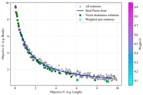 Therefore, the multi-objective formulation for the SPRD in this paper can be described by Formula (10). It aims to achieve an optimal pipe layout that balances multiple competing objectives.