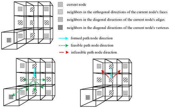 Notably, the grid discretization can employ either uniform or non-uniform grids. Uniform grids result in an exponential increase in grid count as the space expands or grid size decreases. Non-uniform grids, such as those generated by the octree method [26,27], can significantly reduce grid counts in large spaces. However, non-uniform grids are less convenient for constraint representation and algorithm implementation. Since this paper focuses on the multi-objective A* algorithm and its comparative analysis, the uniform grid discretization is adopted. Future work will investigate its performance in non-uniform grid spaces. A smaller grid size improves routing precision but increases computational cost; thus, the grid size is typically set comparable to the diameter of the smaller pipes.