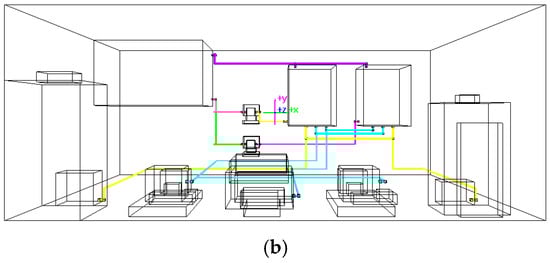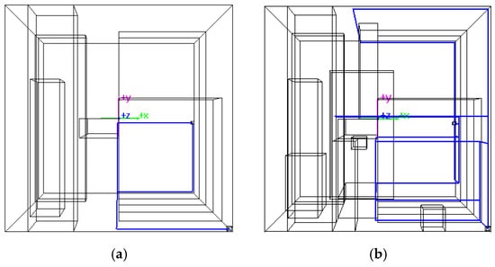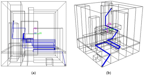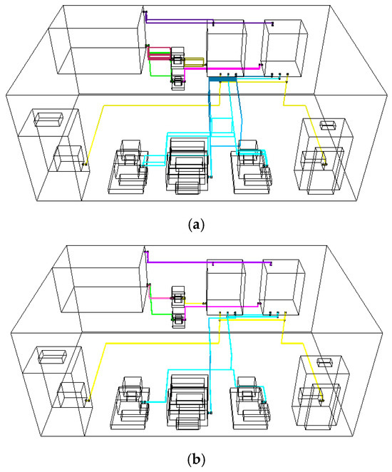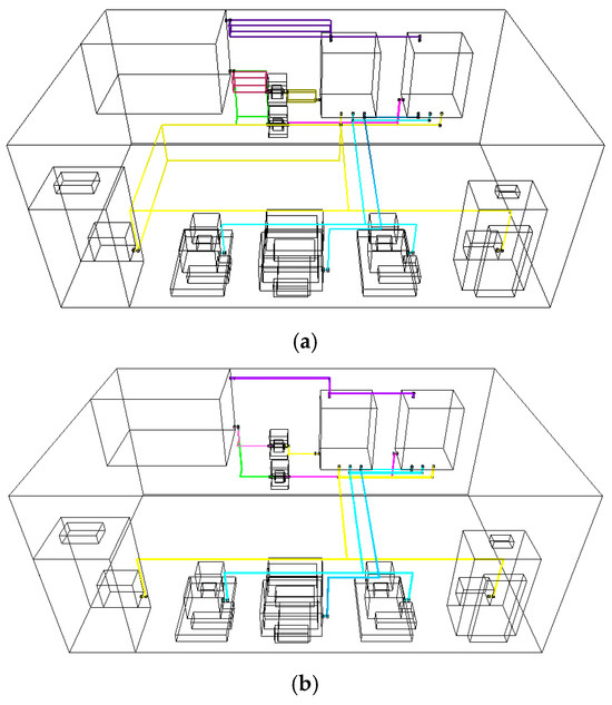Comparison between partial orthogonal and fully orthogonal pipe layouts. (a) LTotal = 52,850 mm, BTotal = 38, RTotal = 6, TTotal = 78,039 ms; (b) LTotal = 54,150 mm, BTotal = 29, RTotal = 6, TTotal = 10,485 ms.