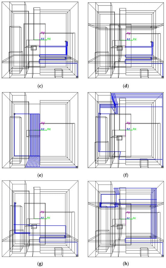 In addition, the optimal layout reported in [8] achieved a total pipe length of 58,160 mm with 68 bends. In contrast, the improved MOA* variants proposed in this study produced several solutions that outperform these metrics. Figure 19a,b illustrate orthogonal routing results, which are superior to those presented in [8], while Figure 19c,d show non-orthogonal routing solutions obtained by enabling the orthogonal “NE” and “SE” directions.