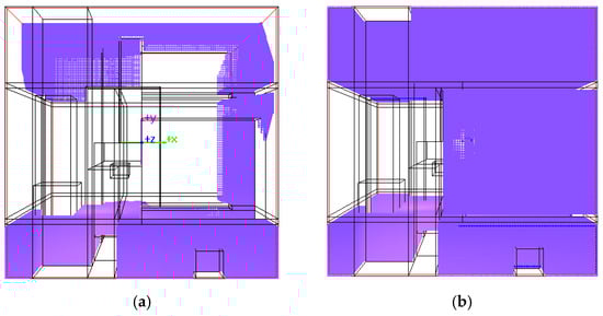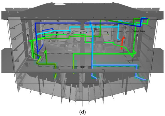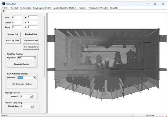To address the SPRD problem, the authors’ team developed a three-dimensional ship pipe route design software based on C++ and OpenGL technologies, integrating various design algorithms. The spatial meshing effect of the STL model and the interfaces for this case study are shown in Figure 18.