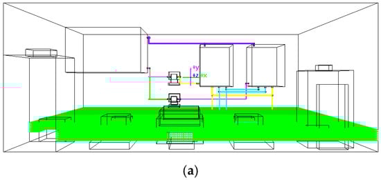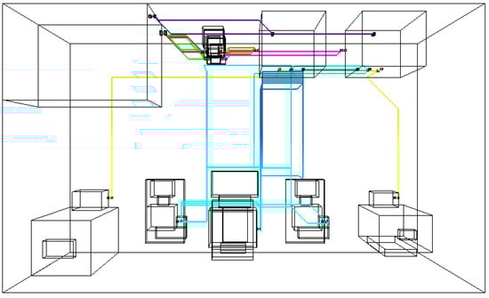First, the grid energy is initially set to 0, thereby excluding the path energy objective from searching. When energy is not considered, the pipe layout design prioritizes straight pipe runs and minimal bends over proximity to the floor or equipment surfaces. The routing results are shown in Figure 13.