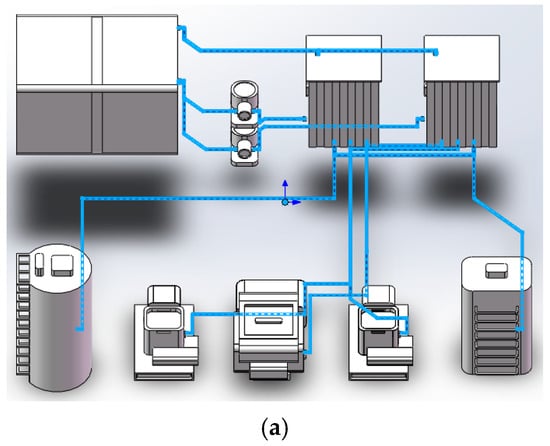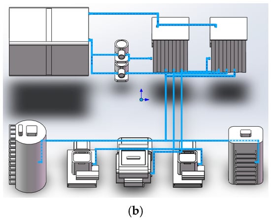 In this experiment, without considering grid energy, the MOA*_weight_dynamic algorithm is allowed to explore nodes in both orthogonal and horizontal diagonal directions (“EU”, “ED”) during pathfinding. The Pareto optimal paths are shown in Figure 16, revealing the presence of 135-degree bends. Figure 17a illustrates the user-selected layout from Figure 16 integrated into the original CAD model. Compared to the orthogonal pipe layout in Figure 17b generated by the same algorithm, the non-orthogonal configuration reduces total pipe length by 1300 mm but requires 9 additional bends and increases runtime by approximately 68 s. To mitigate the complexity introduced by non-orthogonal directions, a constraint can be added in step 2.5.1 of the MOA* to ensure that the bending angle formed between the new neighboring node and its adjacent predecessor node is not acute. If the angle is acute, this neighbor is discarded. After this change, the performance improves by approximately 10%. When installation conditions allow, non-orthogonal pipe design can shorten the pipe length and save workspace, consistent with the rationale behind manual piping practices.