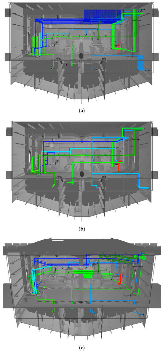 - Park, J.; Storch, R.L. Pipe-routing algorithm development: Case study of a ship engine room design. Expert Syst. Appl. 2002, 23, 299–309. [Google Scholar] [CrossRef]
