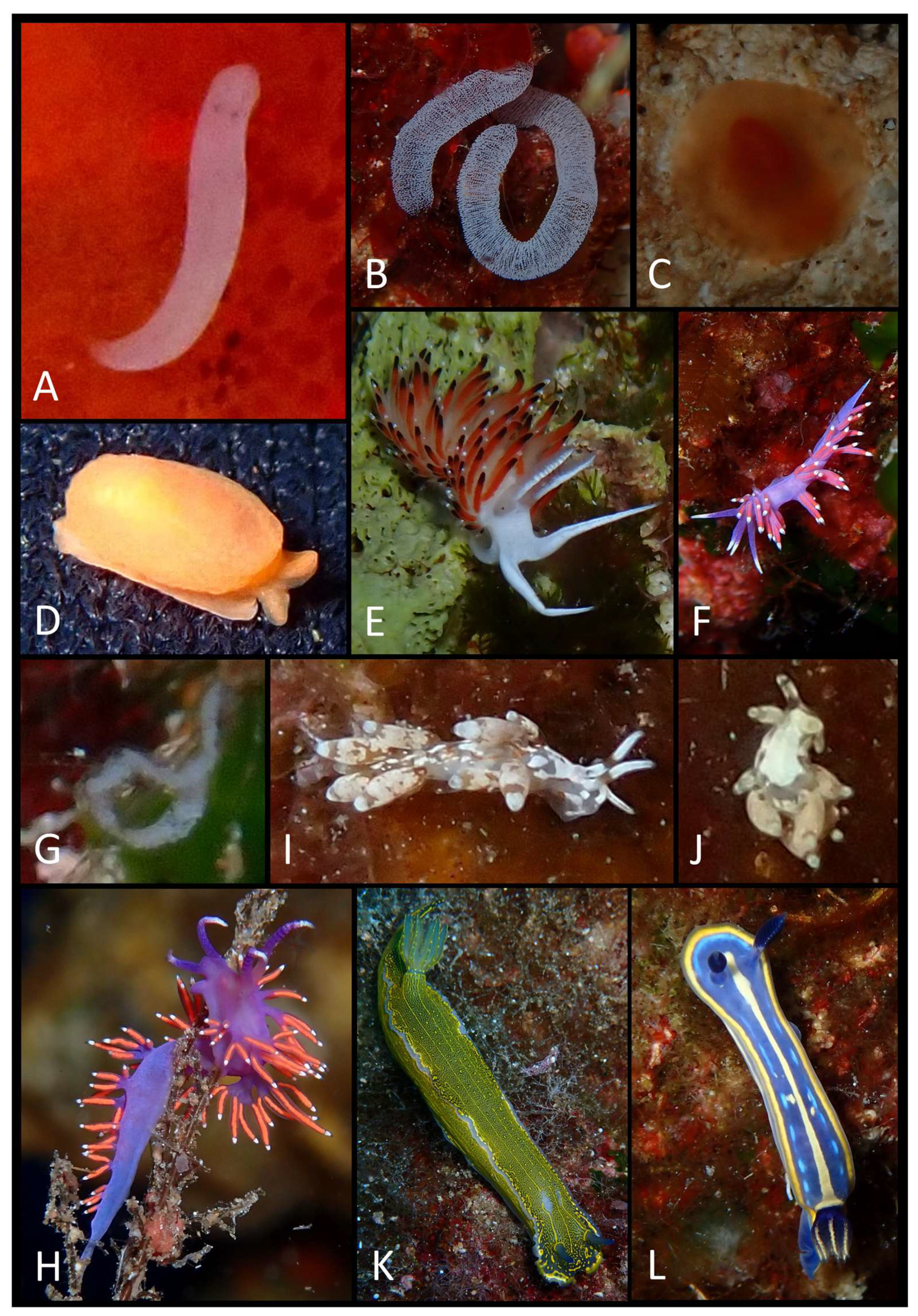 - Trainito, E.; Doneddu, M. Nudibranchi del Mediterraneo, 2nd ed.; Il Castello: Cornaredo, Italy, 2014; pp. 1–192. [Google Scholar]