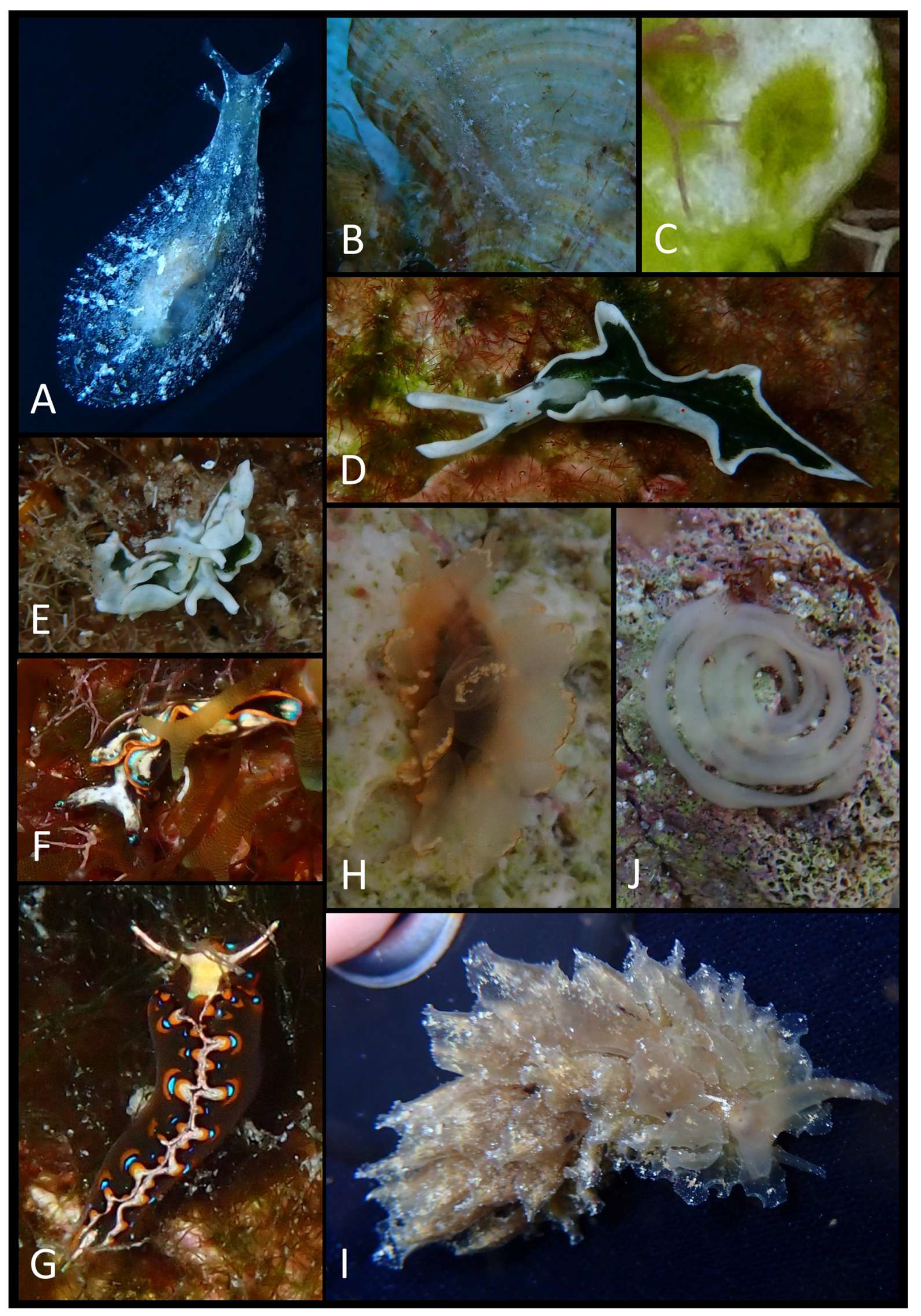 - Lombardo, A.; Marletta, G. The marine Heterobranchia (Mollusca: Gastropoda) fauna of the Aeolian archipelago (Tyrrhenian Sea). First contribution: Lipari and Vulcano. Int. J. Aquat. Biol. 2023, 11, 288–300. [Google Scholar]