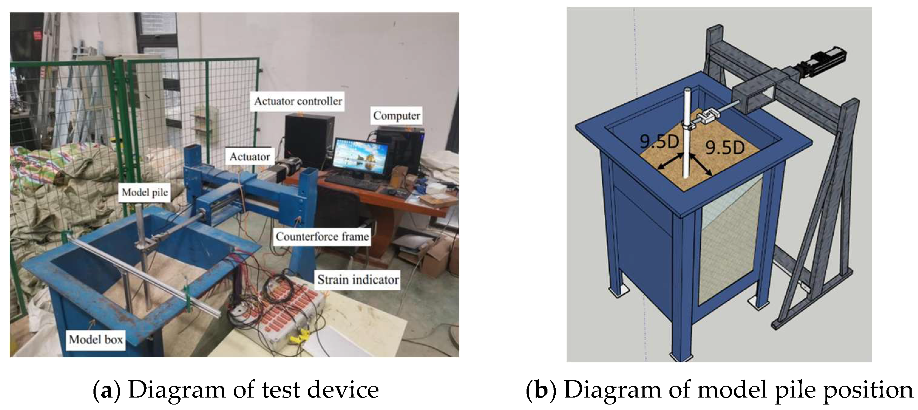 - Rathod, D.; Muthukkumaran, K.; Thallak, S. Experimental Investigation on Behavior of a Laterally Loaded Single Pile Located on Sloping Ground. Int. J. Geomech. 2019, 19, 04019021. [Google Scholar] [CrossRef]