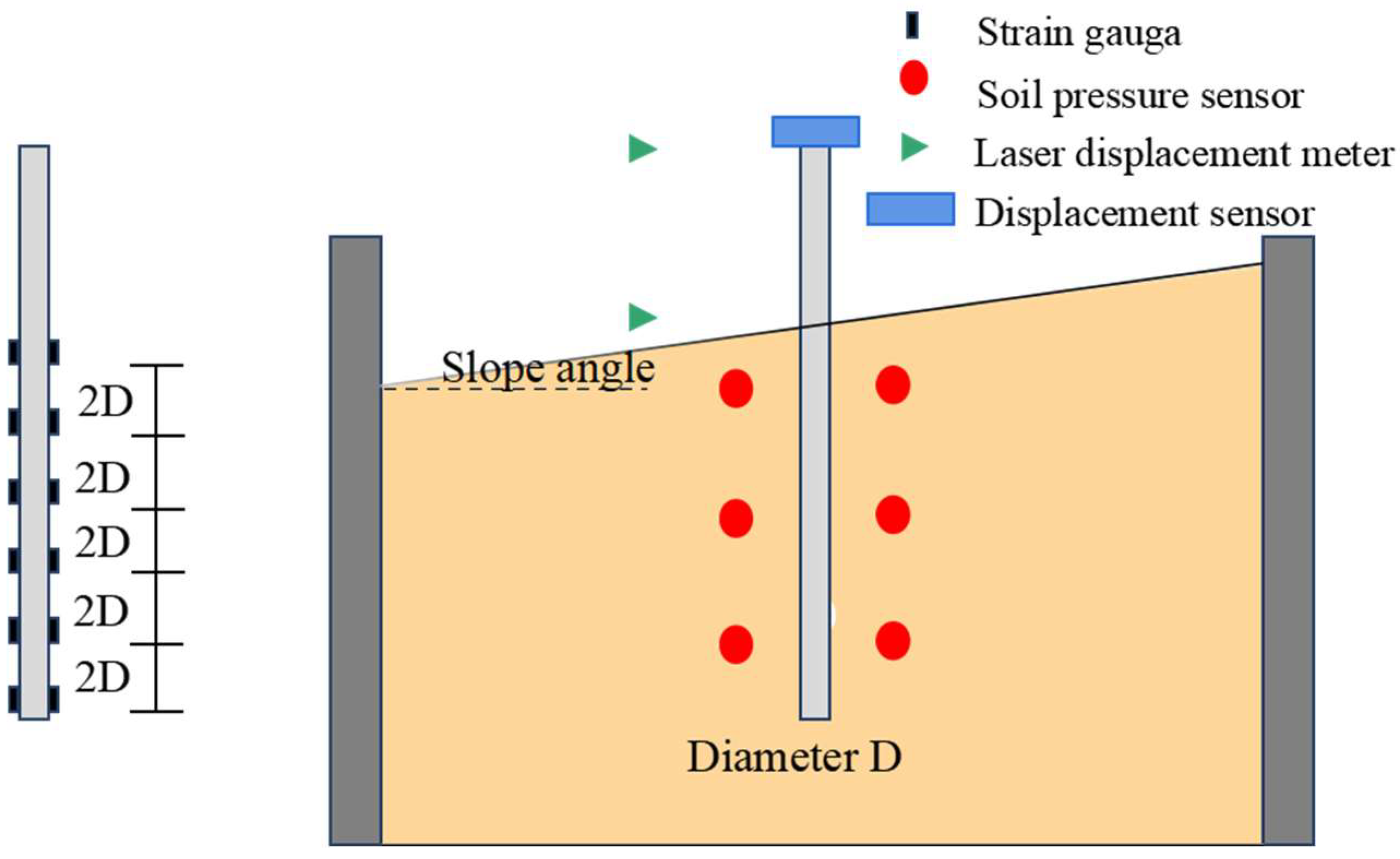 - Zhang, L.; Yue, S.; Peng, W.; Zhou, S. Experimental study on cyclic lateral response of piles in sandy sloping ground. Ocean Eng. 2023, 282, 115056. [Google Scholar] [CrossRef]