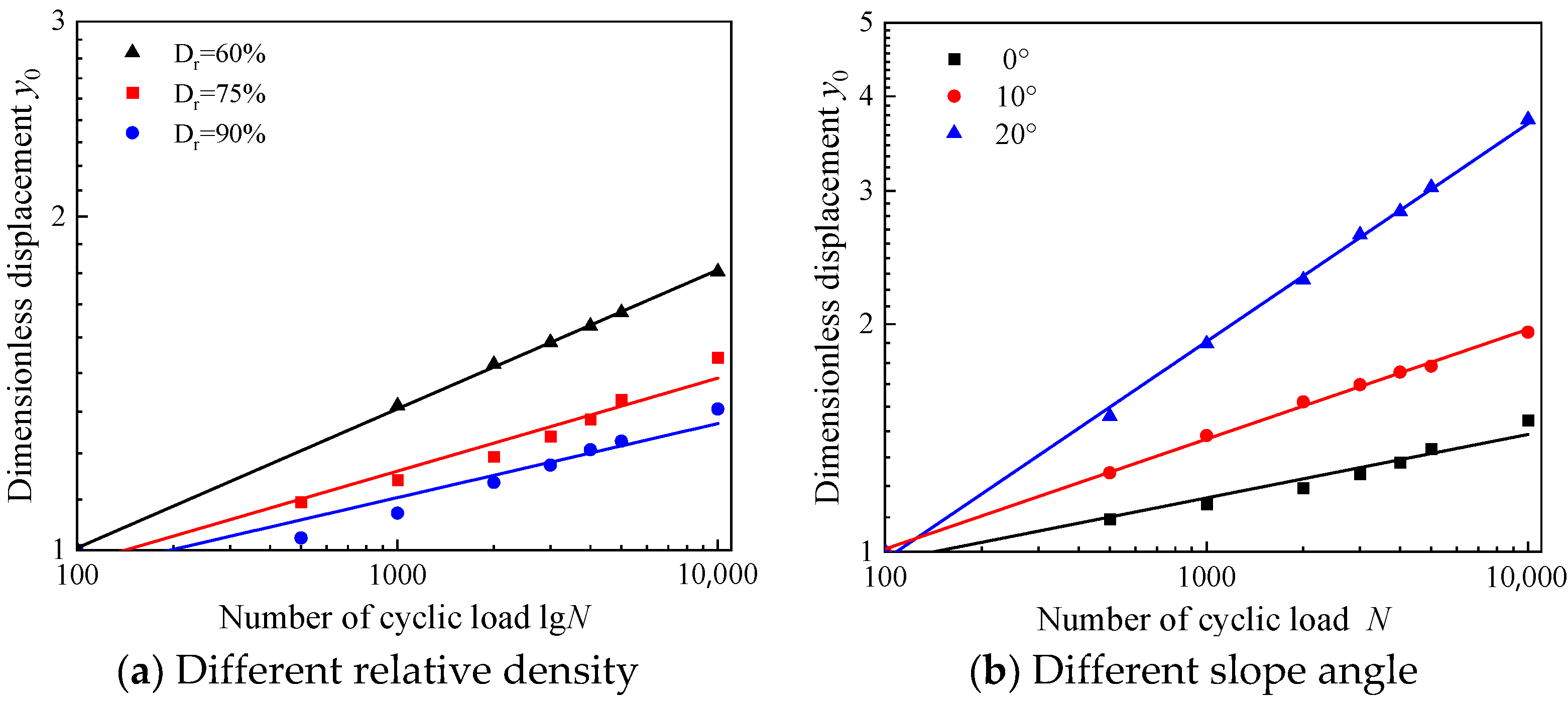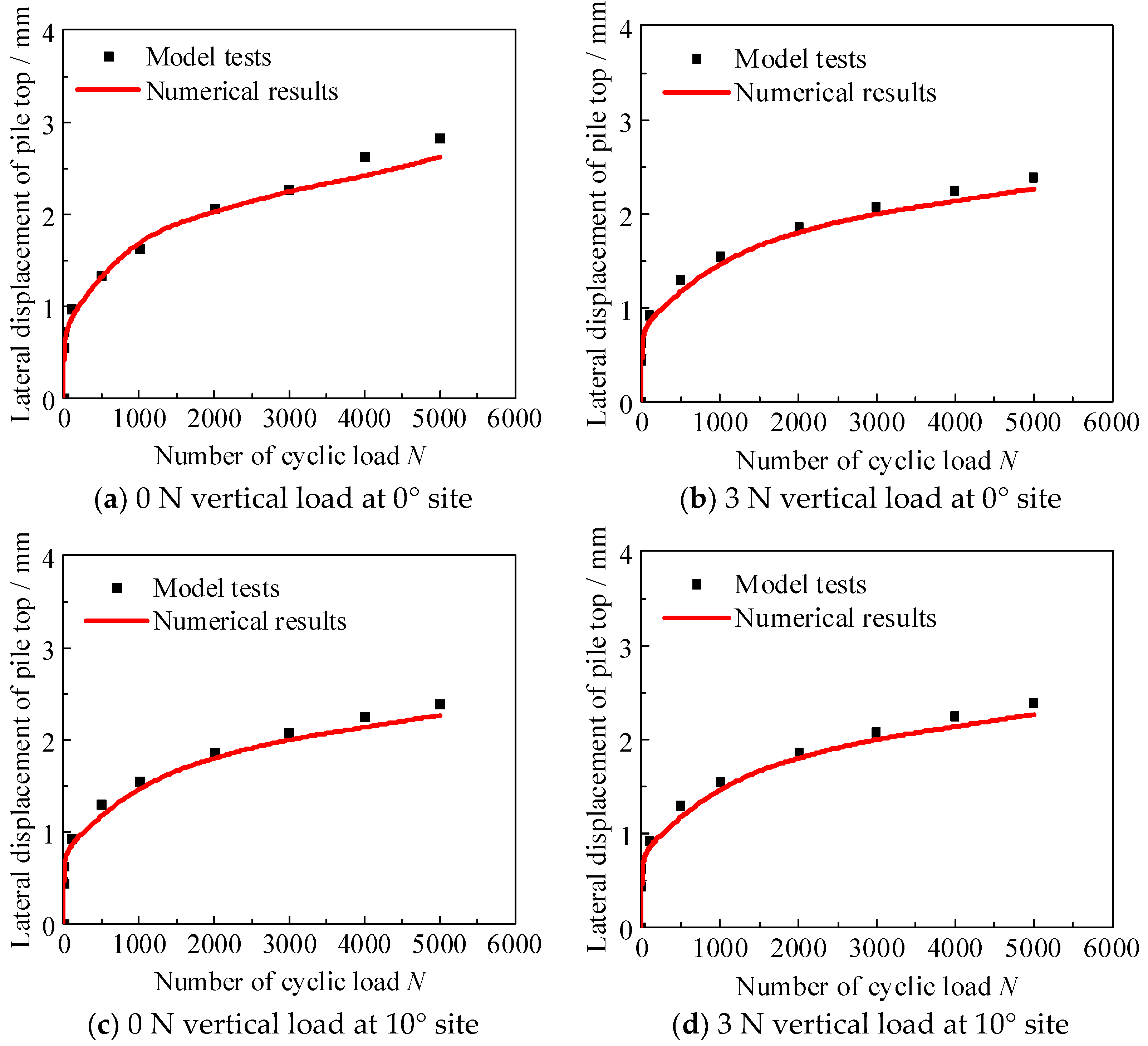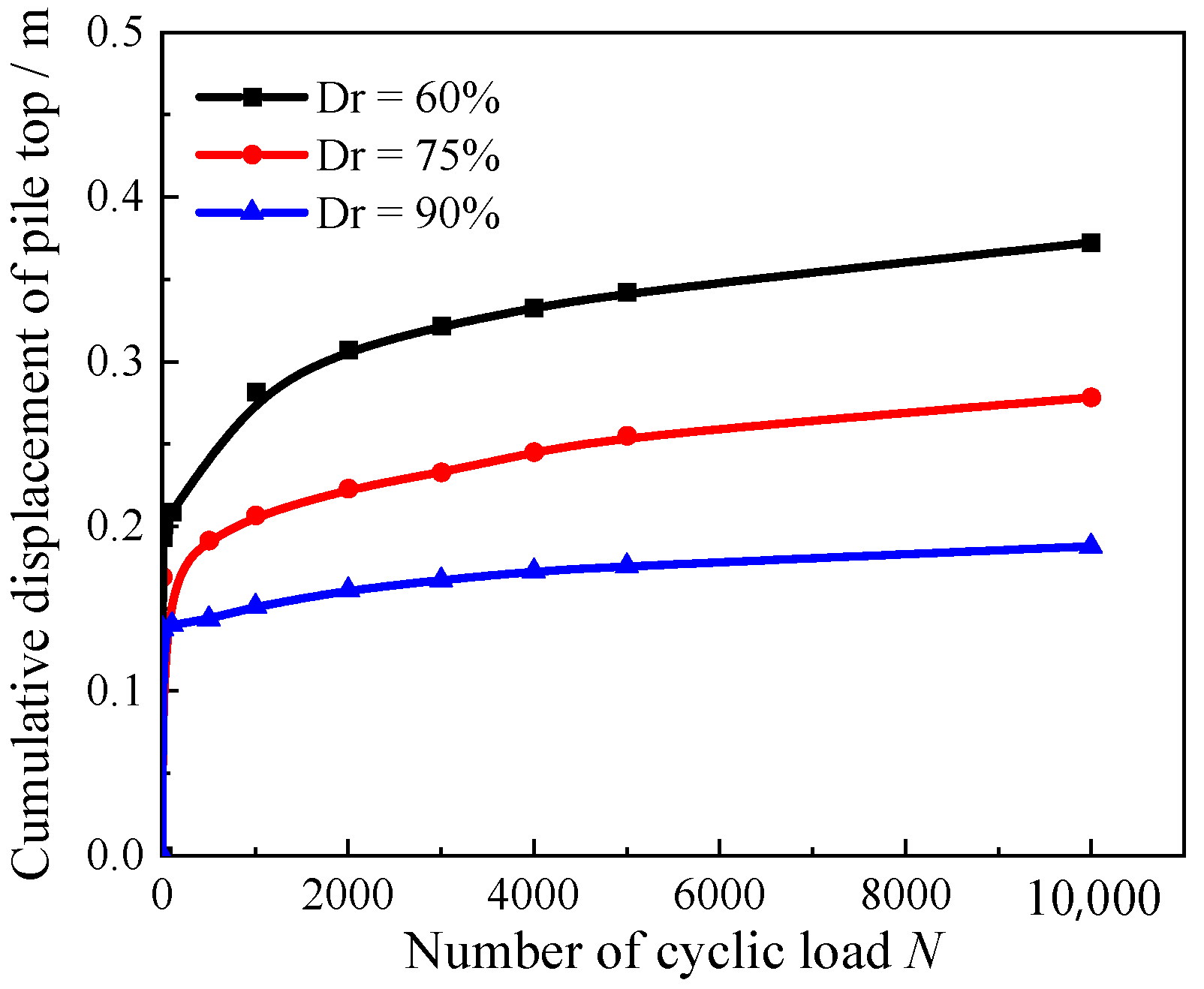 - The cumulative displacement of the pile increases logarithmically with the number of cyclic loads. Deformation of the pile is produced within 1000th cycles. After the 1000th cycle, the deformation of the pile is largely stable.