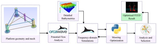 The framework applied in this study follows the sequence illustrated in Figure 4 from left to right. First, the geometry of the semi-submersible platform is defined to generate the mesh using Gmsh 4.1. The resulting meshes are then imported into OrcaWave to perform potential flow analysis with added Morison elements to account for viscous drag and inertia contributions in second-order wave forces. The model is subsequently integrated into OrcaFlex 11.5c, where the detailed bathymetry is incorporated using the 3D seabed option.