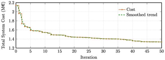 To illustrate the algorithm’s stability, a representative trace for the Catalonia 3-line case is reported. For each iteration, we record the minimum total system cost among feasible evaluations and plot the best-so-far value as a step curve (Figure 5). This feasible-only trace summarizes progress toward cheaper, valid designs while avoiding penalized infeasible evaluations.