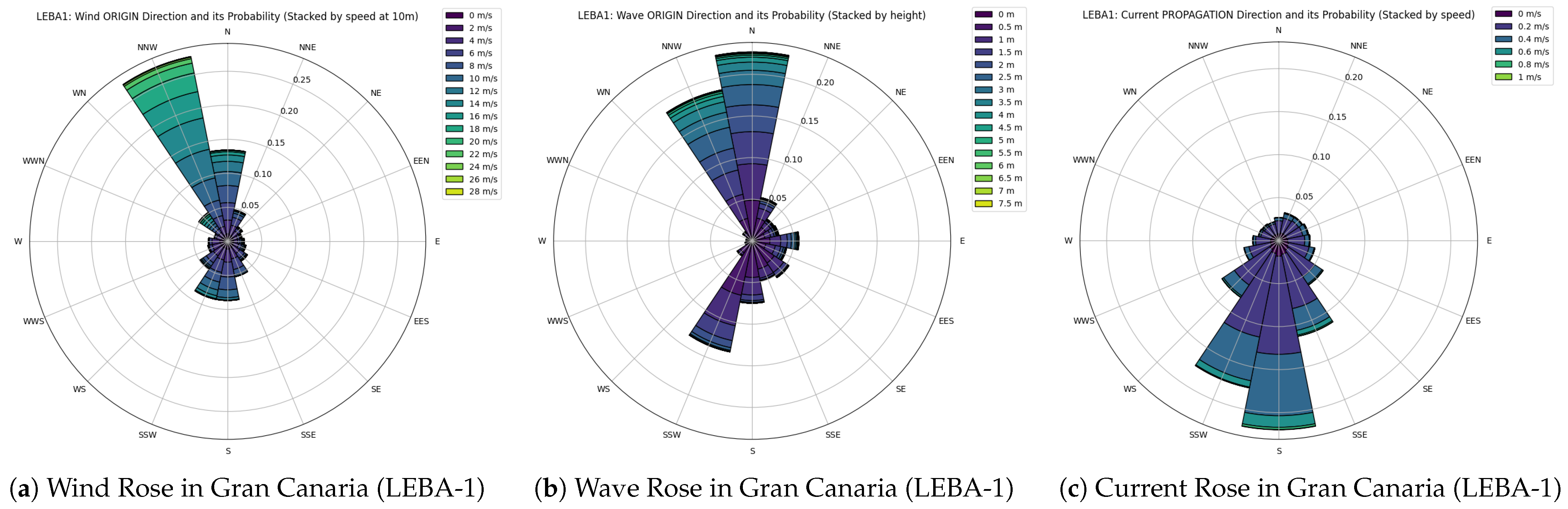 For the Gran Canaria site, a similar system behavior can be observed as for the Catalonia systems, as the responses tighten with increasing line count. The allowed offset utilization drops from 96% (3 lines) to 58% (4 lines) and 34% (5 lines). The airgap usage remains modest at 24–27%, and pitch reduces from 40% to 31–30% of its limit. Yaw motion reaches ≈ 1–2% degrees of its allowance in all cases and is negligible. The utilization of the upwind anchor is 99%, 40% and 71% of the ultimate holding capacity for the 3/4/5-line designs, with negligible downwind demands (≤5%). Bottom-chain MBL usage (upwind) trends 100%, 50%, 91%, indicating the 3-line layout sizes the upwind BC to its limit, while the 4-line configuration shows reduced relative demand. Rope MBL usage is much higher in the upwind than for the downwind groups (upwind ≈ 90%, downwind 5–7%). Forerunner chains (upwind) are loaded with 70–90% of their design limit, downwind ≤10%. LRD target-load utilization (upwind) is 269%, 102%, and 126%, indicating that the nominal target load in the 3-line case is clearly exceeded and would require upsizing for more favorable system responses. In the 5-line case, the system behavior exceeds the target load but is still in a favorable low-stiffness zone. The 4-line configuration indicates an ideal working behavior of the applied LRD.