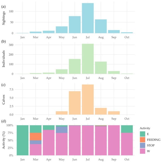 Monthly distribution of sightings and characteristics of fin whales (Balaenoptera physalus) recorded in the SG during the study period. (a) Monthly distribution of the number of sightings, (b) Monthly distribution of the total number of individuals observed, (c) Monthly distribution of recorded calves, (d) Monthly proportion of activity types (westward movement, eastward movement, stationary behavior, and feeding). February, November, and December were not surveyed. In January, only one eastward-moving individual was recorded. The predominance of westward movements reflects the concentration of survey effort during spring and summer, while the main eastward migration into the Mediterranean likely occurs in the unsampled winter months.