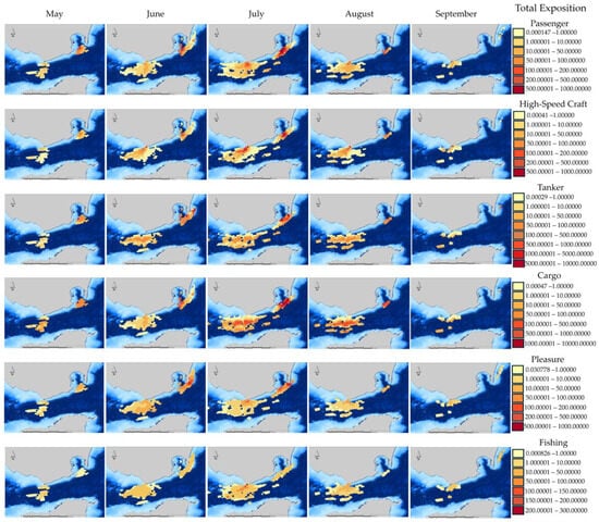 Boxplots of total exposure by vessel type from May to September are presented in Figure 7. In May, cargo and tanker vessels exhibited the highest total exposure, followed by pleasure and passenger vessels. In June, tanker and pleasure vessels showed the greatest exposure, followed by cargo and passenger vessels. In July, cargo vessels again stood out, followed by tankers and passenger vessels. In August, cargo and tanker vessels showed the highest exposure, followed by passenger and high-speed craft. In September, pleasure vessels displayed the highest total exposure values.