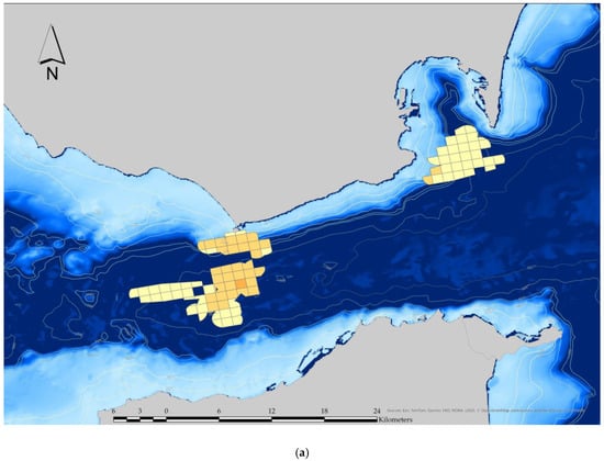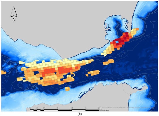 To highlight the months and vessel types associated with the lowest and highest total exposure, fishing activity was depicted as the example of minimal exposure (Figure 6a), whereas cargo vessel activity in July was shown as the example of maximal exposure (Figure 6b).
