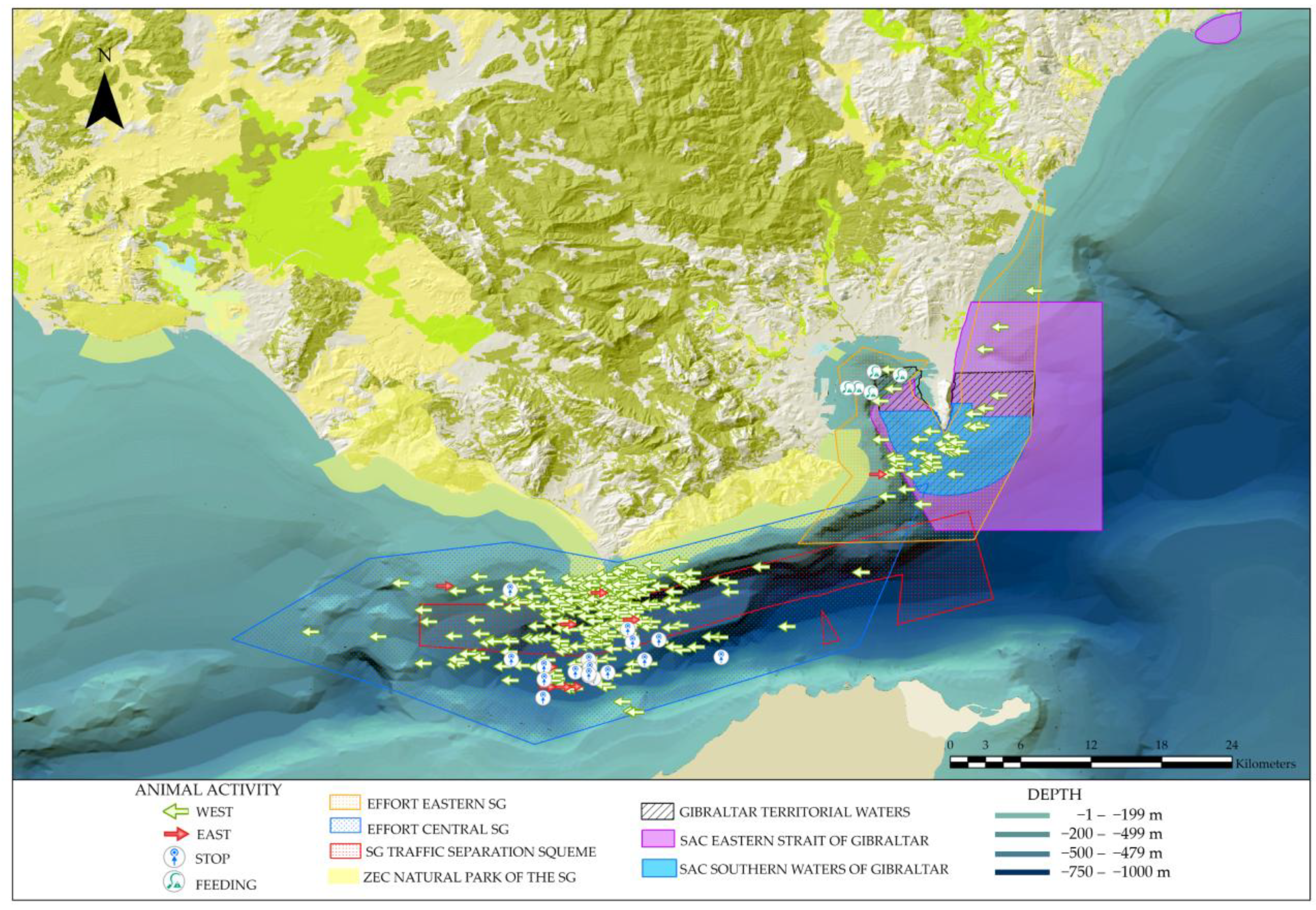 - Scuderi, A.; Campana, I.; Gregorietti, M.; Moreno, E.M.; García Sanabria, J.; Arcangeli, A. Tying up Loose Ends Together: Cetaceans, Maritime Traffic and Spatial Management Tools in the Strait of Gibraltar. Aquat. Conserv. Mar. Freshwat. Ecosyst. 2024, 34, e4066. [Google Scholar] [CrossRef]