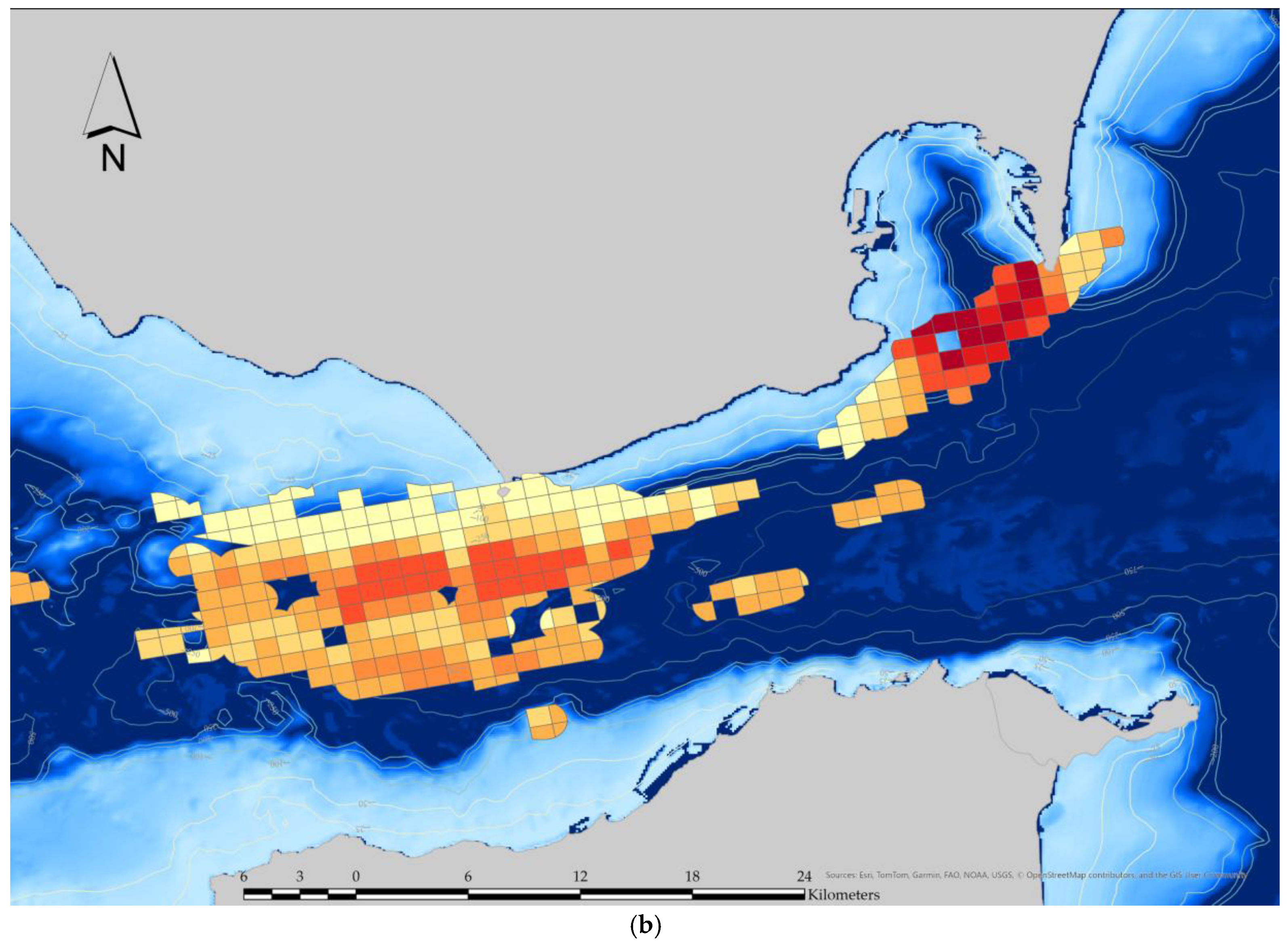 - Vaes, T.; Druon, J.N. Mapping of Potential Risk of Ship Strike with Fin Whales in the Western Mediterranean Sea: A Scientific and Technical Review Using the Potential Habitat of Fin Whales and the Effective Vessel Density; Publications Office of the European Union: Luxembourg, 2013. [Google Scholar] [CrossRef]
