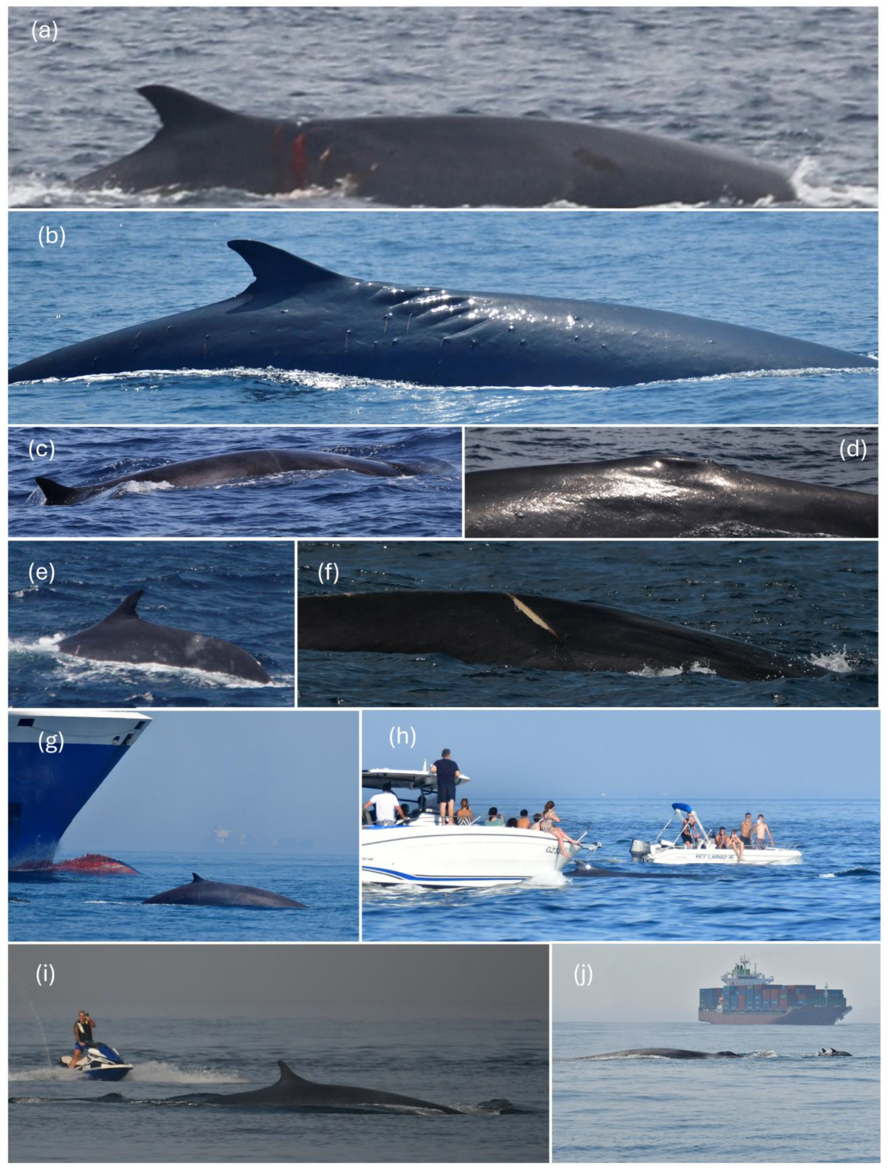 - Espada, R.; Degollada, E.; Belda, E.J.; Feliu-Tena, B.; Martín-Moreno, E.; Tort, B.; Olaya-Ponzone, L.; Anfruns, I.; Gallego, V.; Gil, P.; et al. Match the Whale: Monitoring Fin Whale (Balaenoptera physalus) Migration between the Western Mediterranean Sea and the Strait of Gibraltar. In Proceedings of the Poster presented at the 36th Conference of the European Cetacean Society, Ponta Delgada, Portugal, 14–16 May 2025. [Google Scholar]