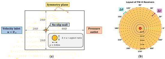 Computational setup and acoustic receiver layout: (a) CFD domain boundaries and cylinder geometry with applied boundary conditions; (b) Distribution of FW–H receivers for SPL measurements.