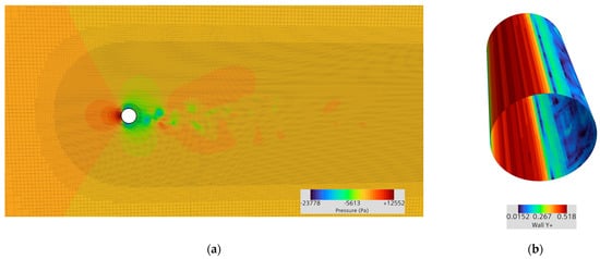 The simulations were conducted using Siemens STAR-CCM+. The computational domain employed inlet boundary conditions with varying flow velocities and no-slip walls applied to cylinders of different geometries, as illustrated in Figure 1a. To accurately capture the turbulent flow and near-wall behavior, mesh refinement and non-dimensional wall distance () were carefully verified. The refinement region encompassed the turbulent wake, as shown in the pressure field distribution in Figure 2a. The near-wall mesh was configured to maintain , as indicated in Figure 2b. To satisfy the Courant–Friedrichs–Lewy (CFL) condition and ensure adequate frequency resolution under the Nyquist criterion, the simulation time step was set to . The flow domain was modeled as incompressible water, and the detailed grid and solver settings are summarized in Table 2.