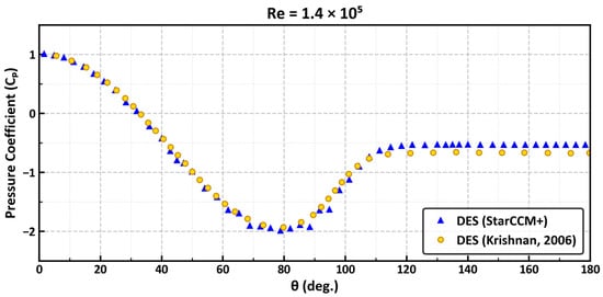 To confirm the suitability of the present simulation, the pressure coefficient () distribution along the cylinder surface was compared with reference data [15]. As illustrated in Figure 3, the results show close agreement with the reference dataset. Both the separation point and the overall pressure distribution exhibit a similar trend, thereby validating the reliability of the current CFD setup.