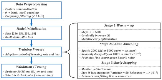 Model performance was assessed using the root mean squared error (RMSE) on the held-out test set. RMSE provided a direct measure in decibels, representing average SPL discrepancies across receivers and frequency bands. Lower RMSE values indicated improved agreement with reference data, and this metric was consistently used to evaluate alternative hyperparameter settings and learning schedules. The performance results are presented in Section 4, together with validation against the CFD-based acoustic data. The overall training workflow of the DNN, including data preprocessing, model training, and validation procedures, is illustrated in Figure 5 to provide a concise overview of the learning process.