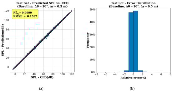 The baseline prediction results are illustrated in Figure 6a. With an adjusted of 0.9999, the DNN demonstrated excellent predictive performance, explaining more than 99% of the variation in the dataset. In addition, the low test RMSE of 0.1587 confirmed the high predictive accuracy for flow-induced noise around cylinders. As shown in Figure 6b, the error distribution histogram indicates that most predictions deviate from the reference data by less than 1%.