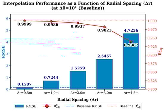 The effect of radial spacing is illustrated in Figure 7, where five prediction cases under the baseline angular spacing were compared. As radial spacing increased, consistently decreased and RMSE increased, reflecting reduced predictive accuracy. The effect of angular spacing is presented in Figure 8, while the complete distributions of and RMSE across all interval combinations are summarized as heatmaps in Figure 9a,b.