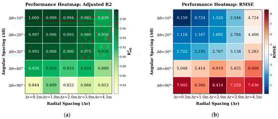 Comparison of performance metrics for all combinations of angular () and radial () receiver spacing: (a) , where lower values correspond reduced predictive performance with coarser spacing; (b) RMSE, where higher values correspond to increased prediction errors with coarser spacing.