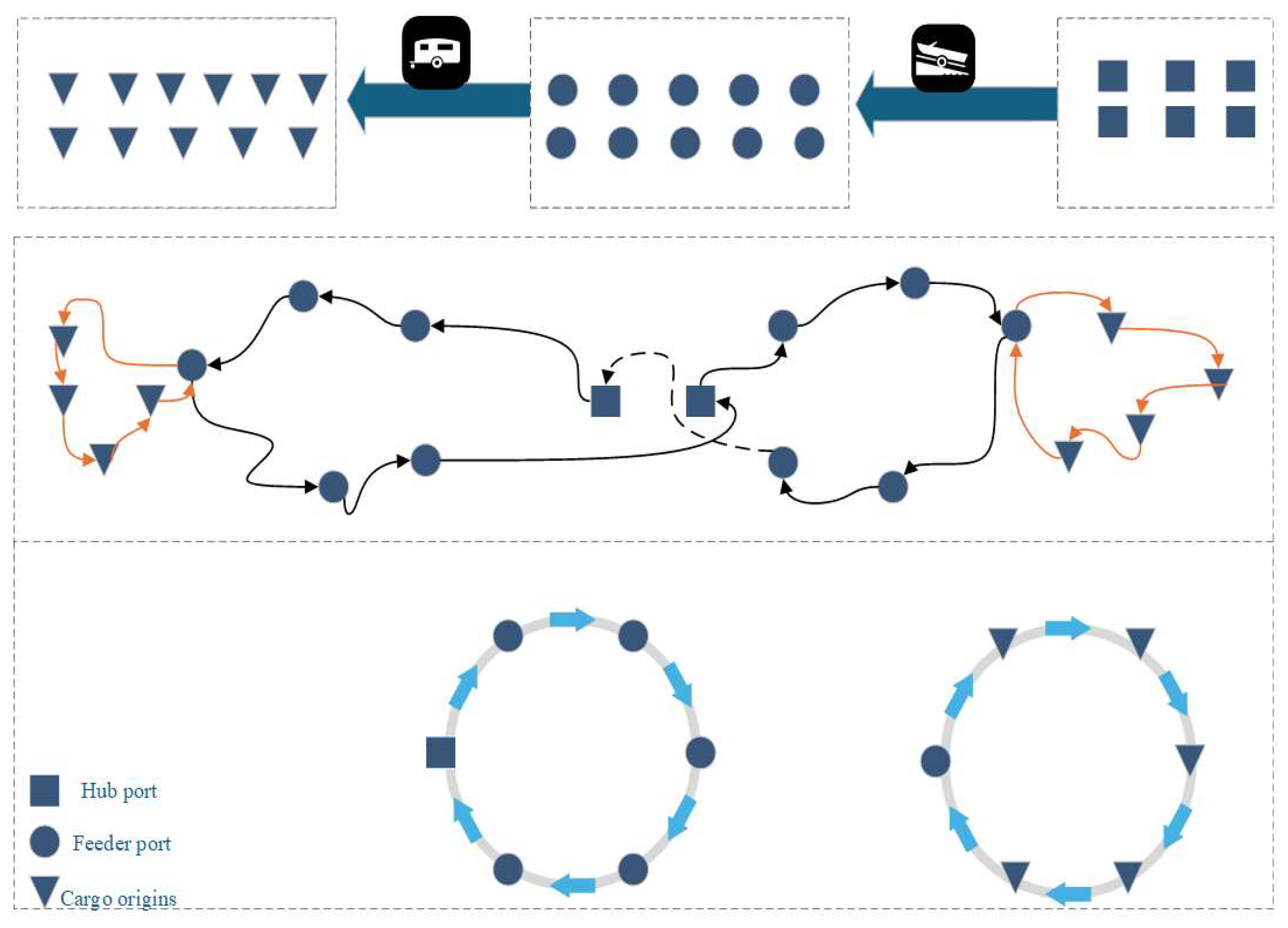 - A three-level transportation network model is structured. The hierarchical network comprising hub ports, feeder ports, and cargo source points is proposed to realistically reflect the coordination between trunk and feeder services in liner shipping operations. Hub ports, as the main nodes of the trunk network, are responsible for handling large-scale cargo collection and distribution. These ports are interconnected via inter-hub trunk lines. Feeder ports, as secondary nodes, collect cargo from nearby origins or distribution centers, and there is also cargo demand between feeder ports, ultimately transporting it to the hub ports. Compared to trunk lines, feeder transport typically involves shorter distances and smaller capacities. Cargo origins, representing the final origin of cargo, are connected only by feeder transport.