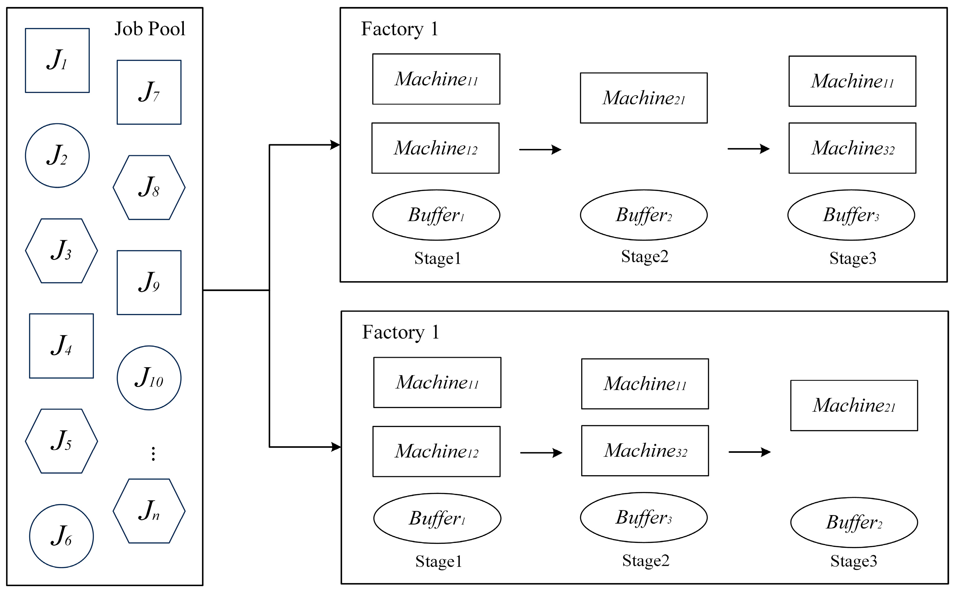 - If job j has already been processed at stage s − 1 and no machine at stage s is free and prepared, but there are spaces in the buffer between stages s − 1 and s, then job j is allocated to the buffer in stage s − 1 and waits for one free and prepared machine m at stage s.