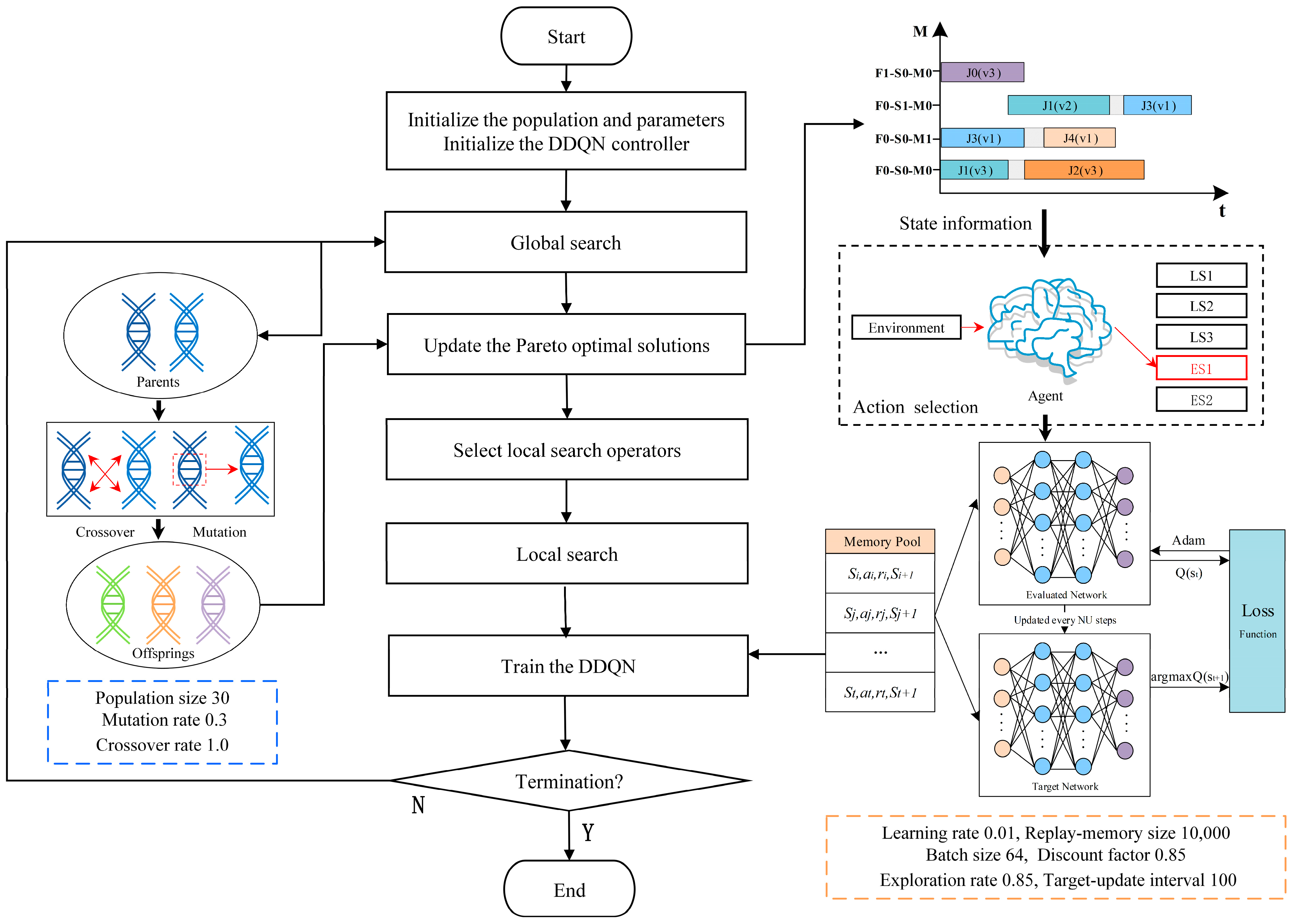 - Action space: The discrete action space is defined as action ∈ {0, 1, 2, 3, 4}, corresponding to preset heuristic operators LS1–ES2. An ε-greedy policy is adopted. If the random number is below ε, an operator is chosen at random. Otherwise, the state vector is tensorized and forwarded to the evaluation network, and the operator yielding the maximum Q-value is selected.