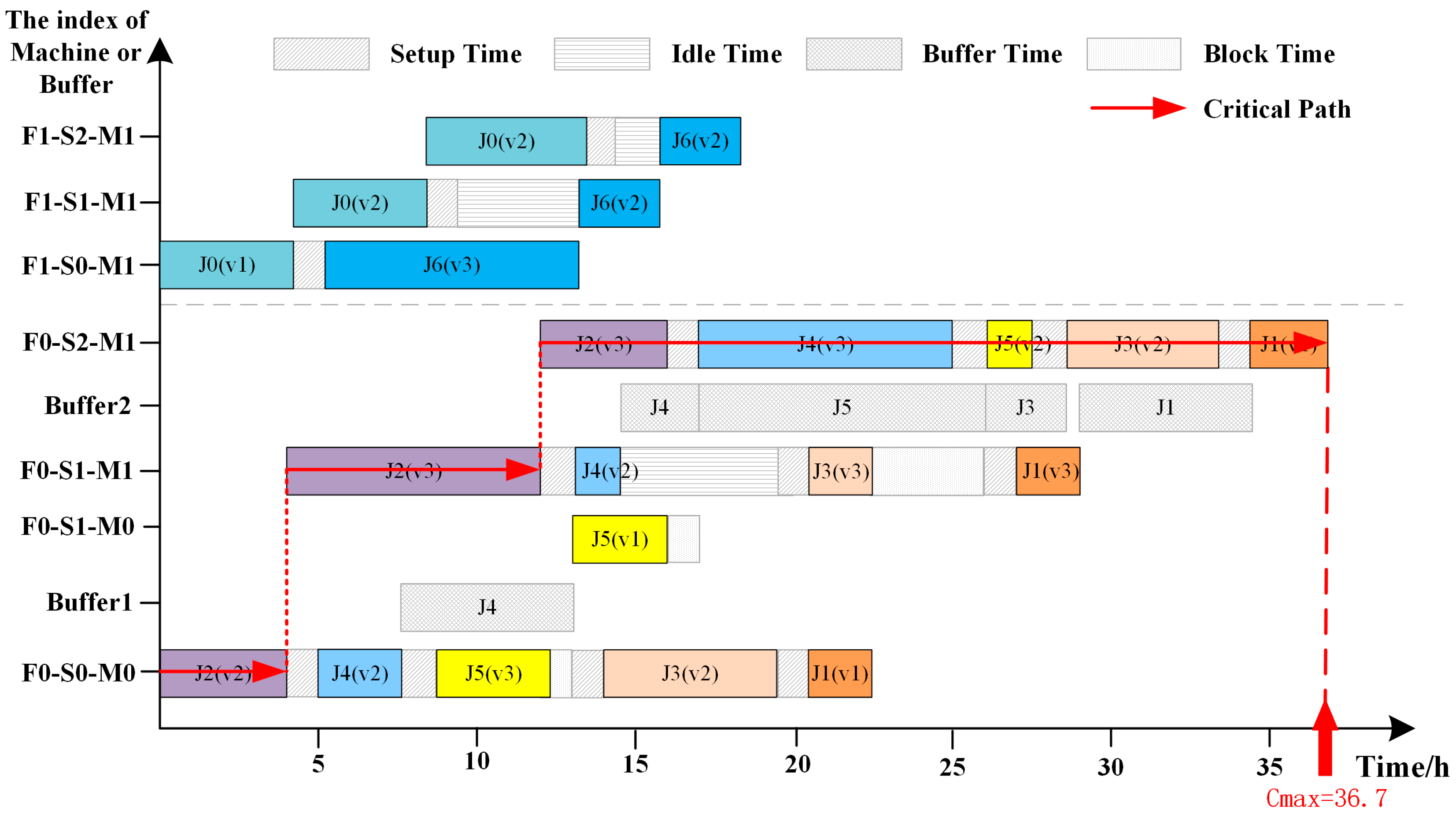- If job j has already been processed at stage s − 1 and a machine m at stage s is free and prepared, job j is assigned to machine m and begins processing at stage s.
