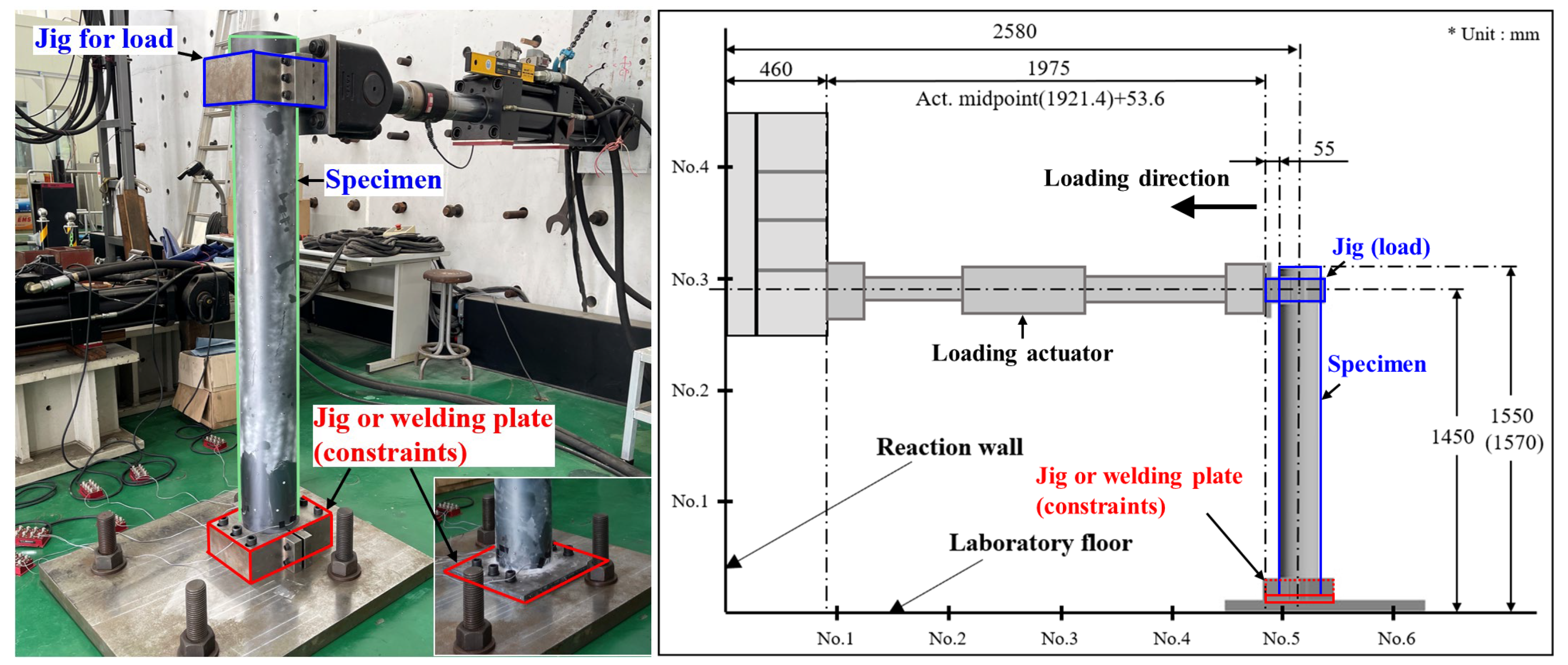 Figure 3 illustrates the test setup and its schematic view. The actuator applied a lateral force at the top of the specimen to simulate the wind load transferred to the tower top in the form of a concentrated force. The specimen was tested under two support conditions: fully supported by welding and frictionally supported by jigs, as shown in