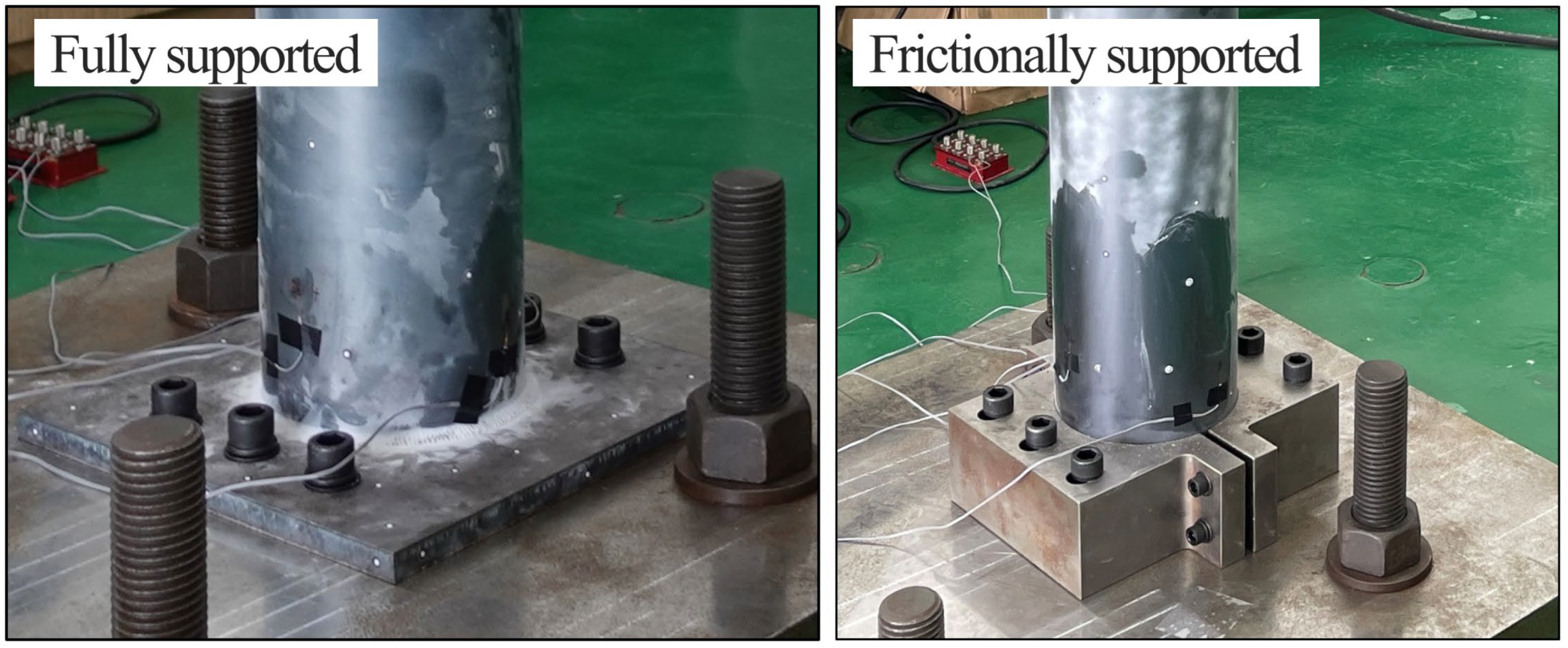 Figure 4. In the frictional support case, the jigs were firmly clamped to ensure adequate frictional resistance, thereby allowing the effects of friction and slip to be investigated. Although this setup does not fully reproduce the actual contact condition of a tower base, it enables investigation of how frictional restraint influences deformation and ultimate capacity. Load and displacement were measured using the actuator’s built-in load cell and a Linear Variable Differential Transformer (LVDT). For the fully supported condition, displacement-controlled loading was applied at a rate of 1 mm/min up to the ultimate strength and 5 mm/min thereafter, while for the frictionally supported condition, a loading rate of 3 mm/min was applied.