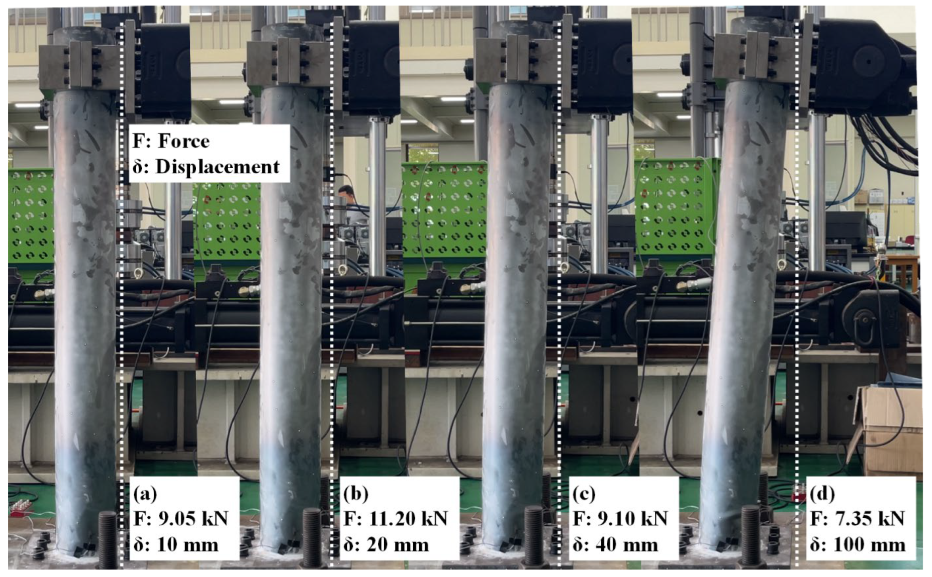 Before setting up a test facility, preliminary analyses using analytical and numerical approaches were concisely performed to determine the minimum required load that can demonstrate the post-ultimate behavior of the specimen. Consequently, an MTS actuator system with a maximum load capacity of 250 kN and displacement of 100 mm was selected. While wind loads typically fluctuate, a static loading condition was adopted to examine the structural ultimate behavior and post-buckling characteristics under extreme load scenarios.