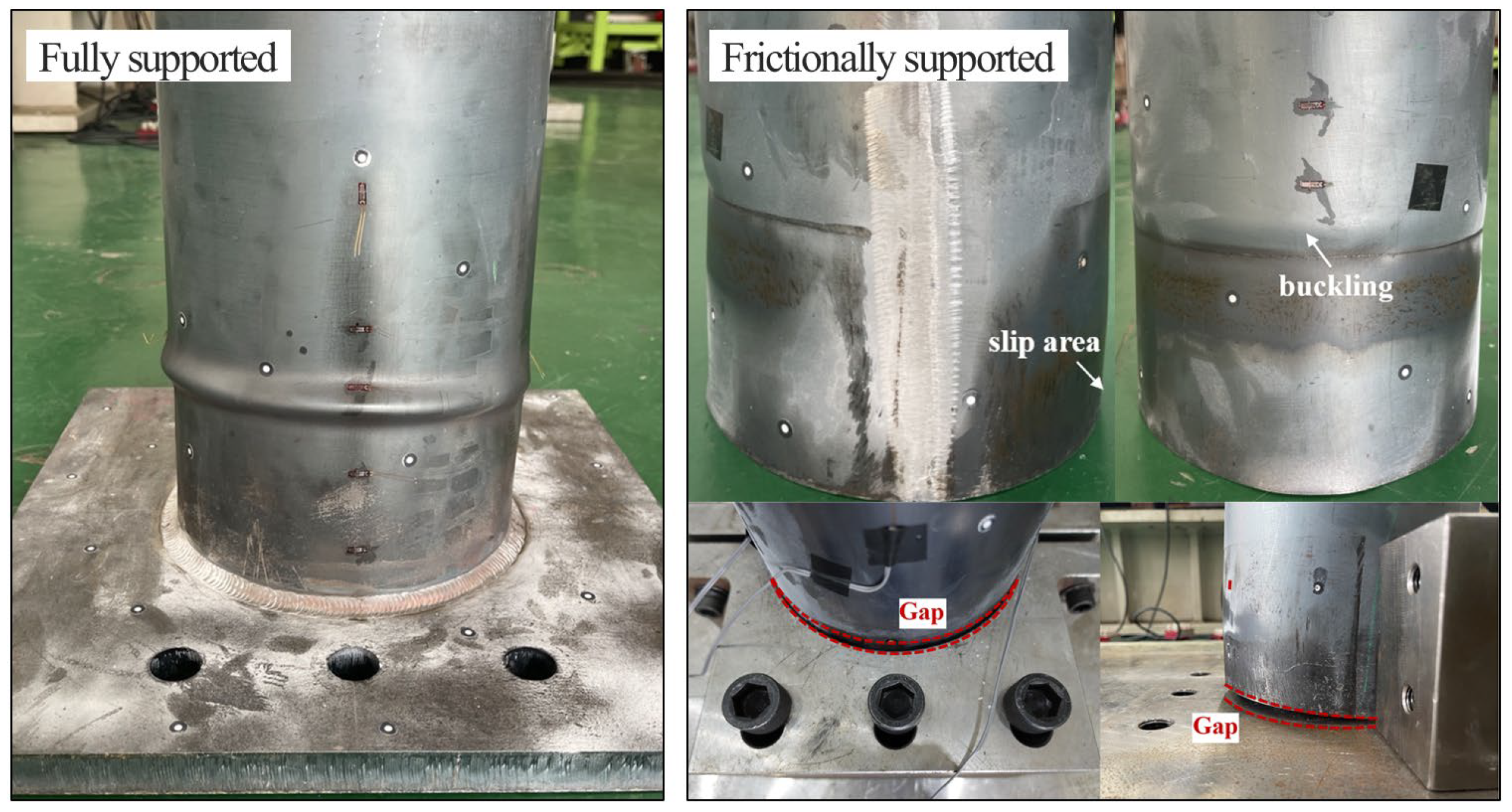 Thus, this study experimentally investigated the buckling and ultimate behavior of a slender steel cylindrical shell structure representing a wind turbine tower under lateral concentrated loading at the upper part, highlighting the influence of boundary conditions. The two types of boundary conditions used in the experiments are as follows. The first condition is a fully supported configuration, in which the bottom of the specimen was completely welded to the lower plate. The second condition is a friction-supported configuration, which allows for the investigation of frictional slip effects. By comparing these two cases, the study evaluated both the ultimate response under idealized full fixation and the post-elastic behavior where friction governs the load transfer mechanism.