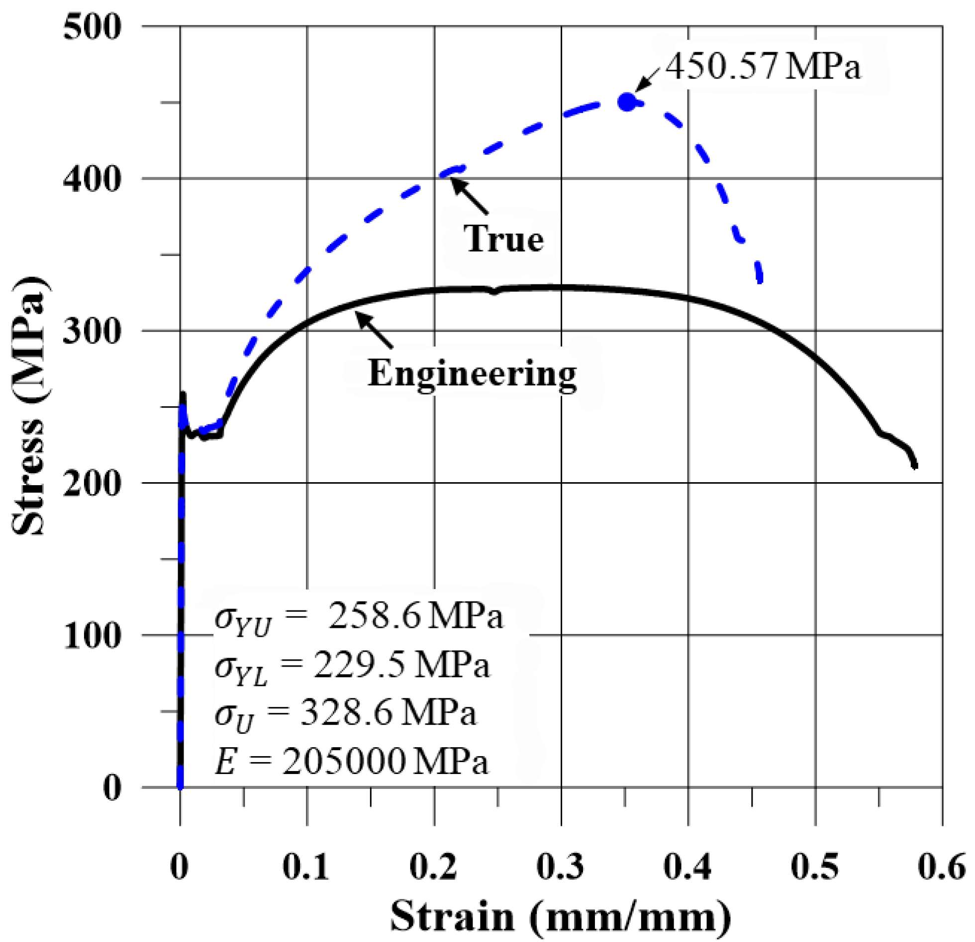 Considering the 5 mm gage length, the corresponding strain rates were approximately 0.0033/s (fully supported) and 0.01/s (frictionally supported), which fall within the static to quasi-static range. The slower rate for the fully supported case enabled a clearer observation of deformation and post-buckling behavior, whereas the slightly higher rate for the frictionally supported case helped maintain stable loading by reducing slip-induced fluctuations at the contact surface. Under these conditions, strain-rate sensitivity of the steel is negligible, and no noticeable frictional heating occurs, since such thermal effects are known to develop only when the relative sliding velocity exceeds approximately 1 mm/s (60 mm/min). Hence, both rate-dependent and friction-induced thermal effects were ignored in this study.