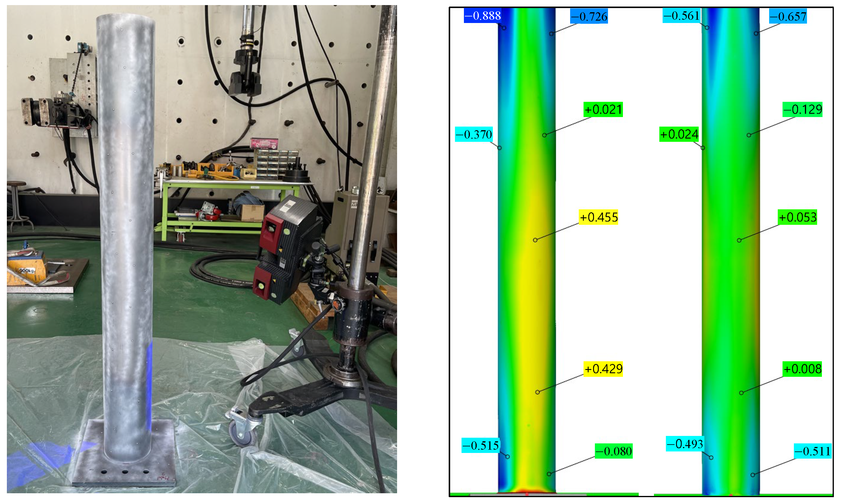 The dimensions of the scaled specimens were determined by considering the limitations of the test facility, including the maximum actuator load and stroke capacity. Under these constraints, it was not feasible to simultaneously match the L/D and D/t ratios of full-scale wind turbine towers. Increasing L/D by reducing the diameter would have produced unrealistically small D/t values, while increasing D/t by using thinner plates would have caused welding difficulties, and large initial imperfections such as deflection and residual stress. To balance these competing factors, preliminary FEA was carried out to select an appropriate combination of diameter and thickness capable of reproducing the representative global buckling and post-ultimate behavior within the capacity of the test setup.