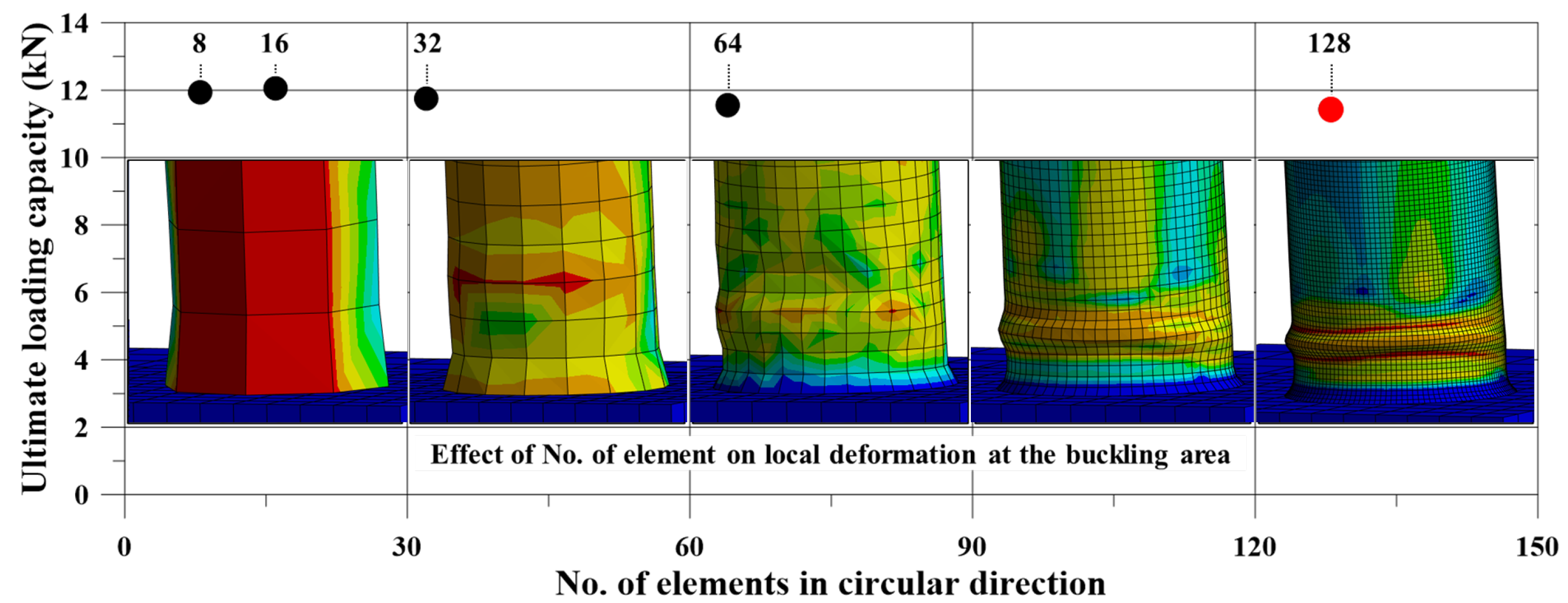Figure 9) confirms that the developed FE model accurately reproduces the local behavior, particularly around the buckling region and the lower boundary of the structure. Furthermore, the numerical results showed close quantitative agreement with the experimental measurements, demonstrating the reliability of the FE model in capturing the local response characteristics.
