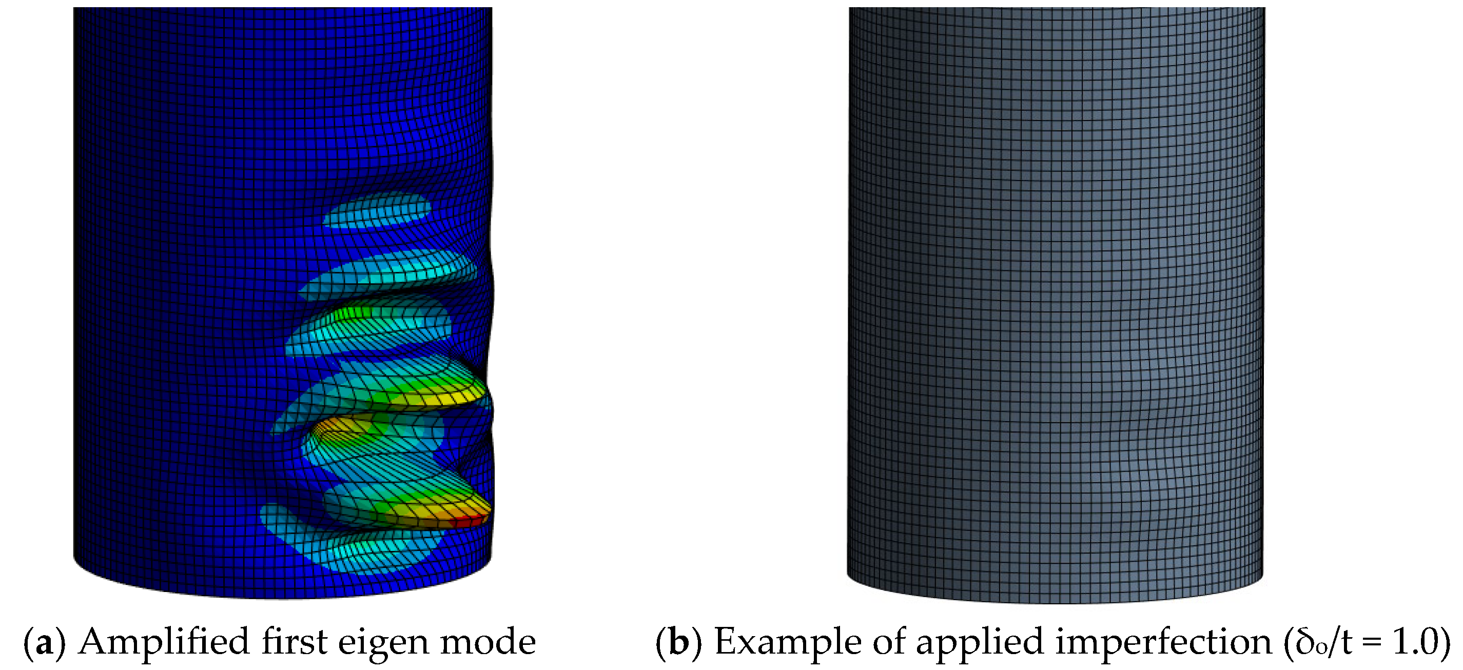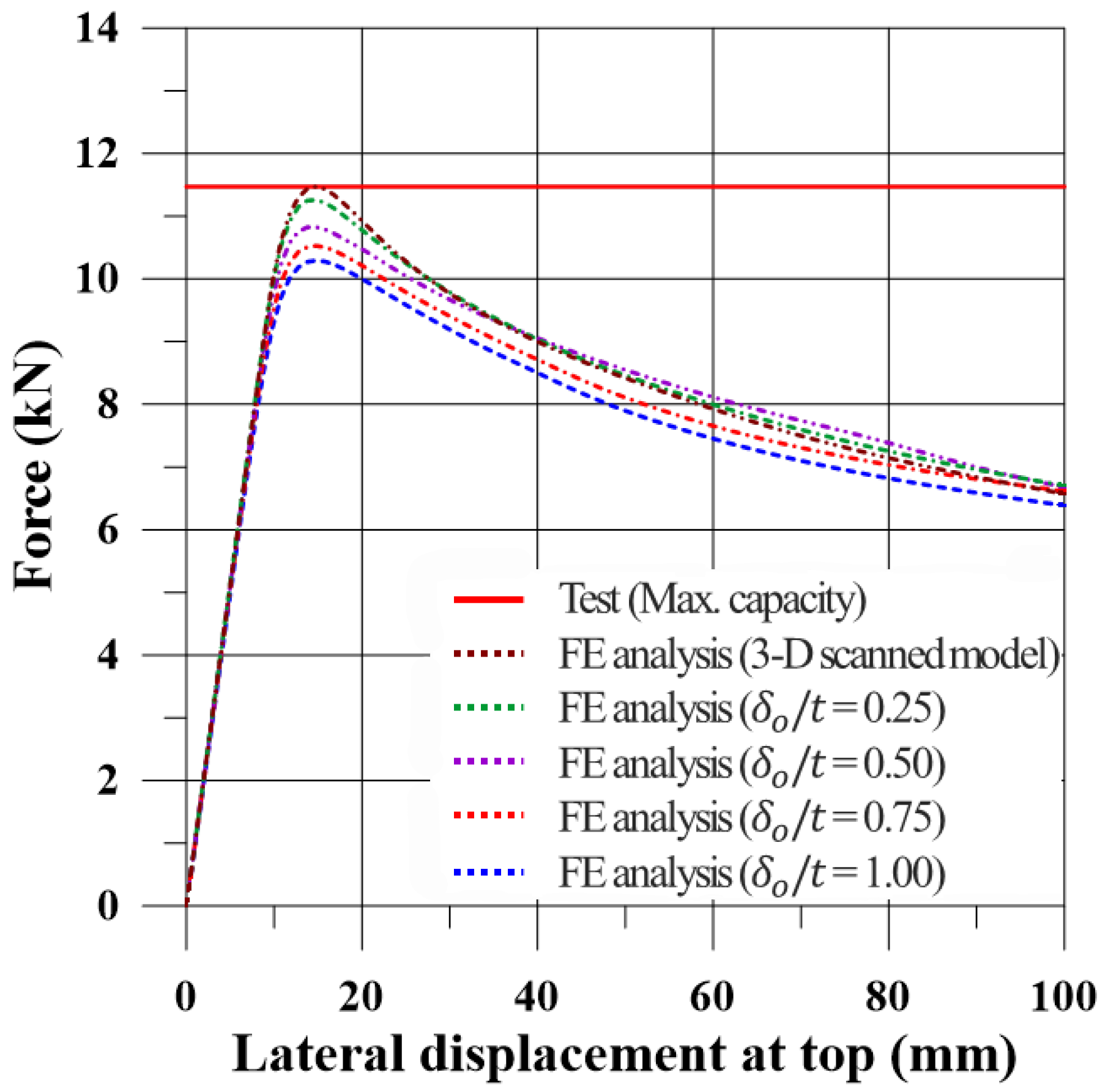 In the fully supported model, the FE framework was systematically validated. The material model employed the true stress–strain curve obtained from the tensile test, and mesh convergence studies confirmed the numerical stability and accuracy of the results. The 3D-scanned geometry showed the closest agreement with the experimental results, corresponding to the behavior of the model with the smallest imperfection amplitude. Moreover, the comparison of different loading types (surface, line, and rigid jig) demonstrated that the simplified line loading accurately reproduced the experimental response.