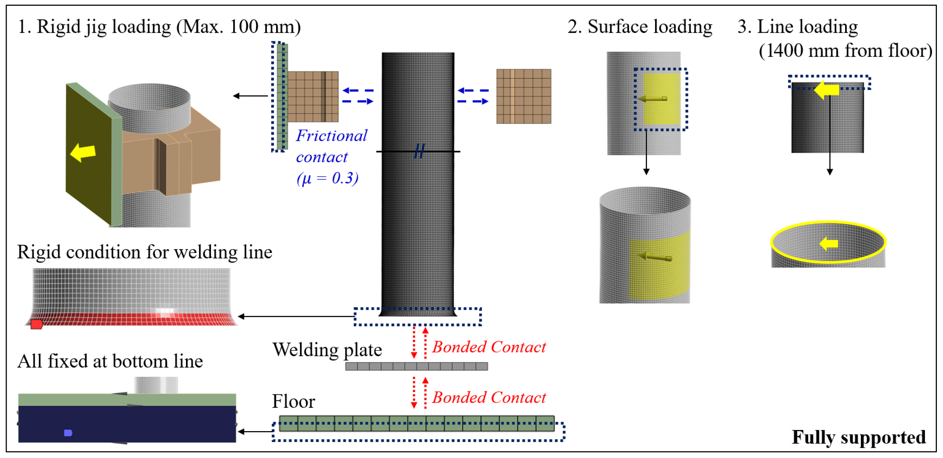 14], leading to the development and validation of a nonlinear FEA technique applicable to actual tower conditions. Additionally, numerical analyses were conducted to investigate the effects of loading type, friction coefficient and contact area, and initial geometric imperfection, providing further insight into the governing factors that influence the global response and ultimate strength of the structure. Through this combined experimental and numerical approach, the study aims to enhance the safety and reliability of wind turbine tower design and provide a foundation for the practical application of nonlinear FEA techniques.