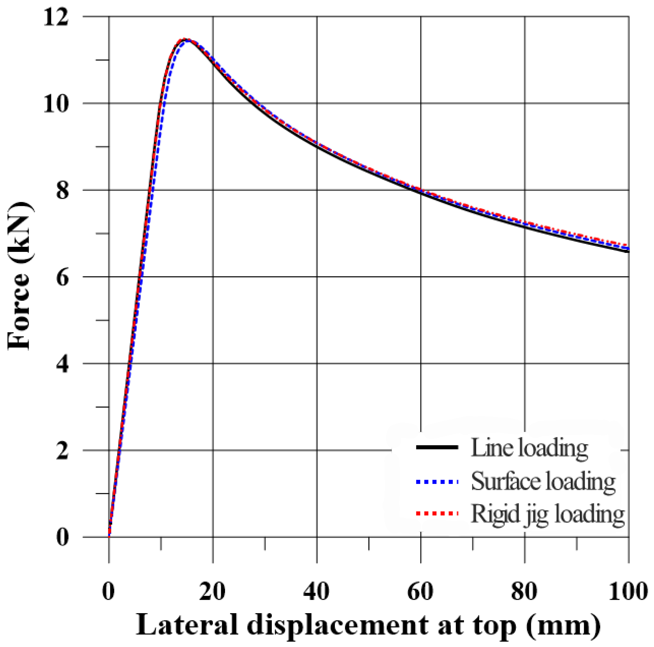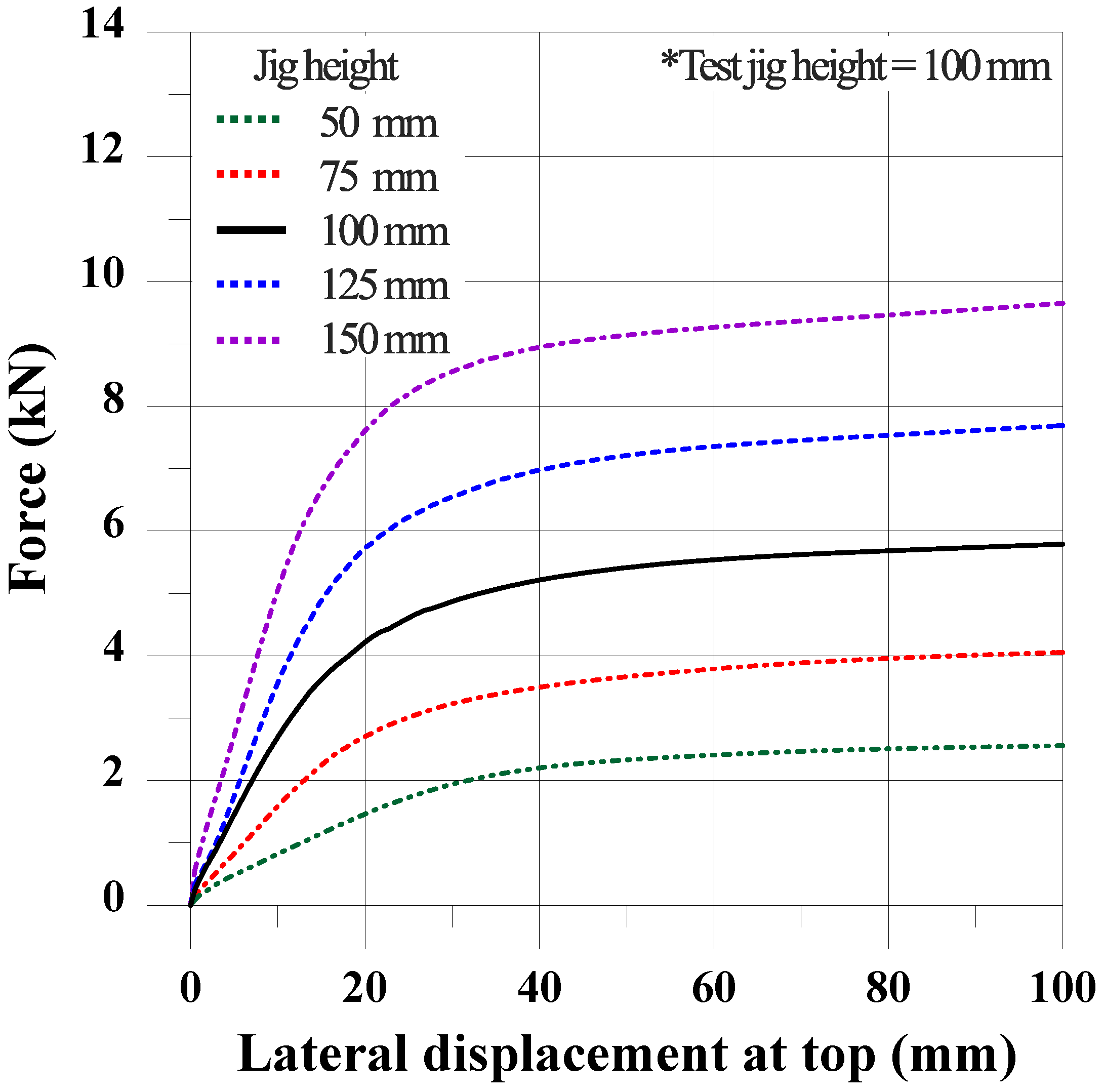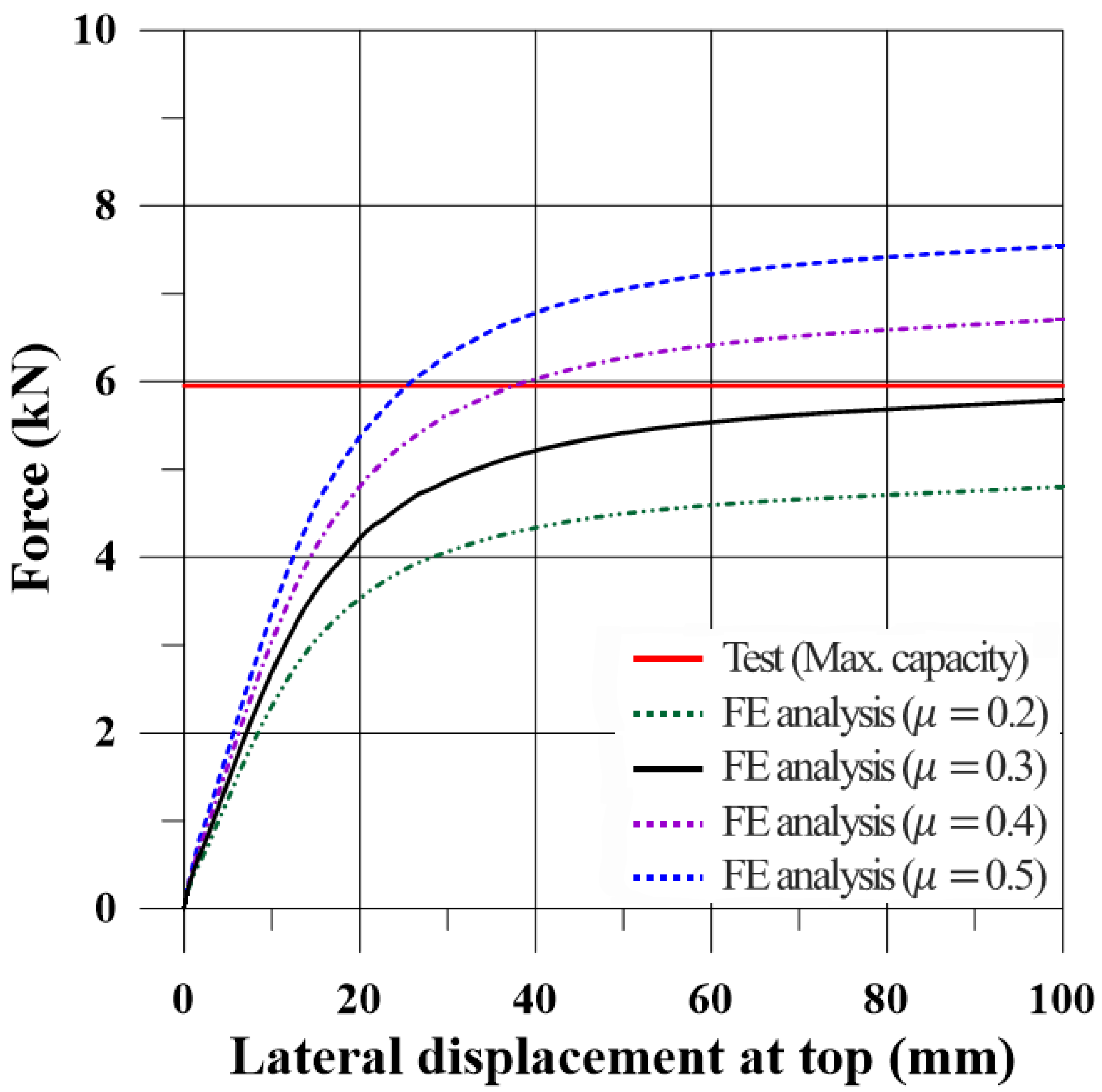 In the frictional support model, the nonlinear static analysis verified that a friction coefficient of 0.3 accurately represented the dry steel-on-steel contact conditions between the specimen and the jig. Increasing the frictional contact area led to higher structural stiffness and maximum strength, demonstrating that the frictional resistance was nearly proportional to the contact area and should be properly accounted for in the evaluation of frictional behavior.
