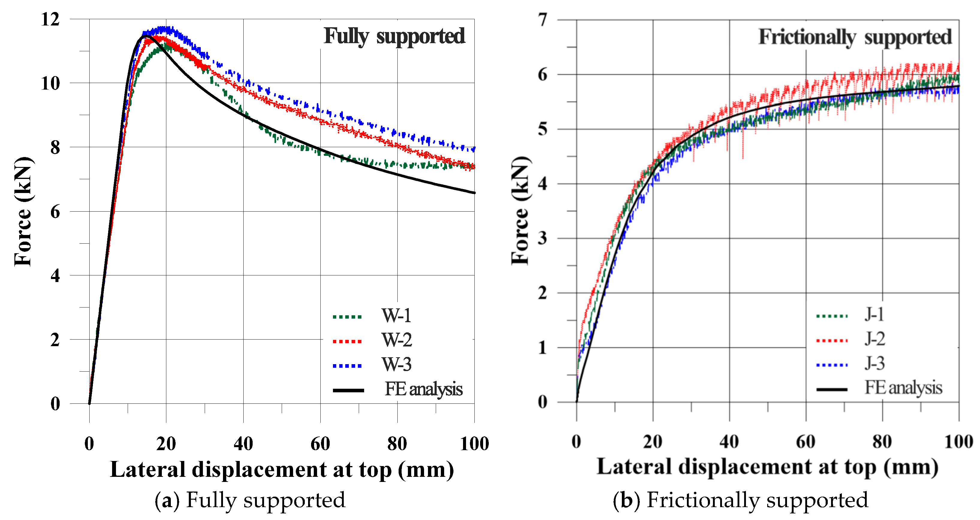 Figure 9 shows the final deformed shapes of the specimens after testing, rather than the instantaneous deformation at the onset of buckling. In the fully supported specimen, pronounced buckling developed near the lower region. In contrast, the frictionally supported specimen exhibited slip marks and progressive localized buckling near the jig contact, accompanied by a visible gap formation at the base.
