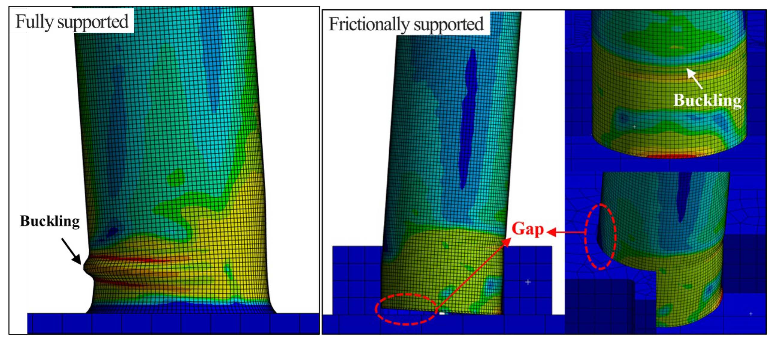 For the fully supported model, the FE model slightly underestimated the post-ultimate behavior compared to the experiments. This discrepancy is mainly attributed to the local stiffening effect induced by the welding at the bottom rim. In the experiments, the welded joint and bead formation increased the local thickness and stiffness near the boundary, which was not fully represented in the simplified FE model that employed a rigid constraint at the base without explicitly modeling the weld bead geometry. Nevertheless, stiffness and ultimate strength, as essential characteristics of the ultimate behavior, were accurately captured by the FE model. By contrast, in the frictional contact case, a slight deviation in initial stiffness was observed at the beginning of loading. This discrepancy may be attributed to the bolted connection between the jig and the specimen in the experiment, which could have required a slightly higher load to initiate slipping compared to the idealized numerical model (as indicated at point (e) in