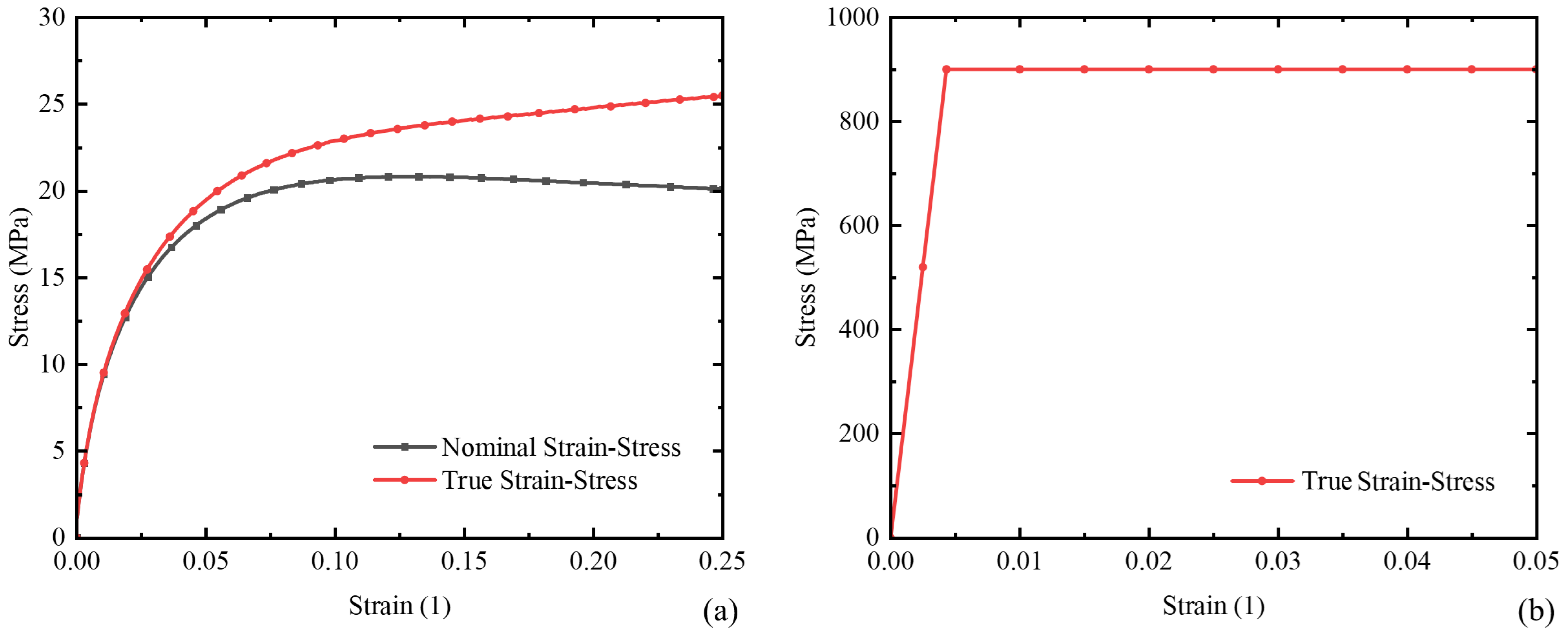 - Between the PE and PA layers, a rough tangential formulation was applied with hard normal contact and separation allowed after contact. This choice ensures that the PE acts purely as a load transmitter without allowing unrealistic sliding at the interface, while still permitting detachment under high internal pressure [39].