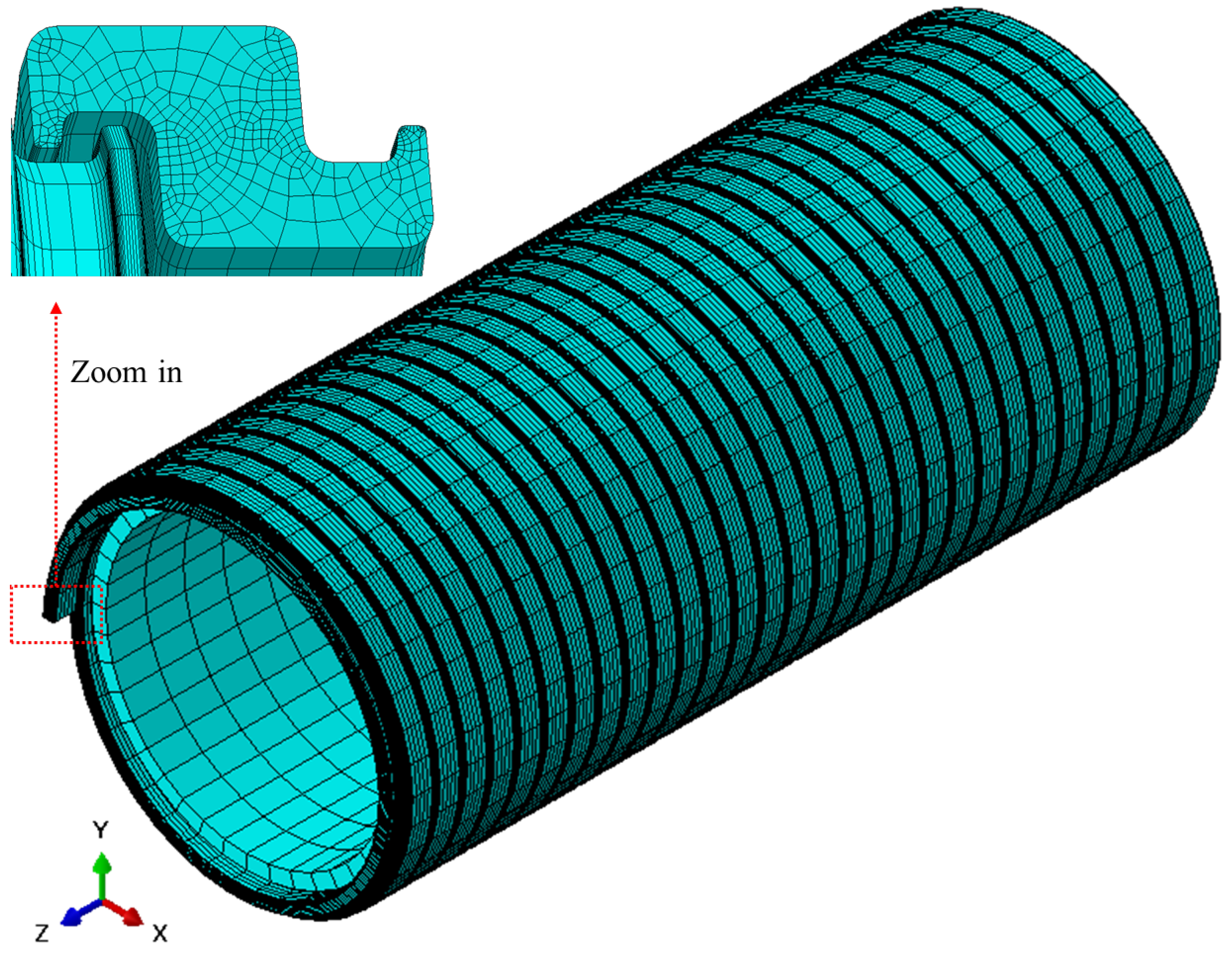 - The axisymmetric 2D model, although extremely fast, significantly underestimated the collapse pressure because it cannot represent the inherently three-dimensional mechanics of the helical strip. The absence of lay-angle-induced bending–torsion coupling, discrete Z-lock contact, and shear transfer between neighbouring strips leads to an underprediction of global stiffness.
