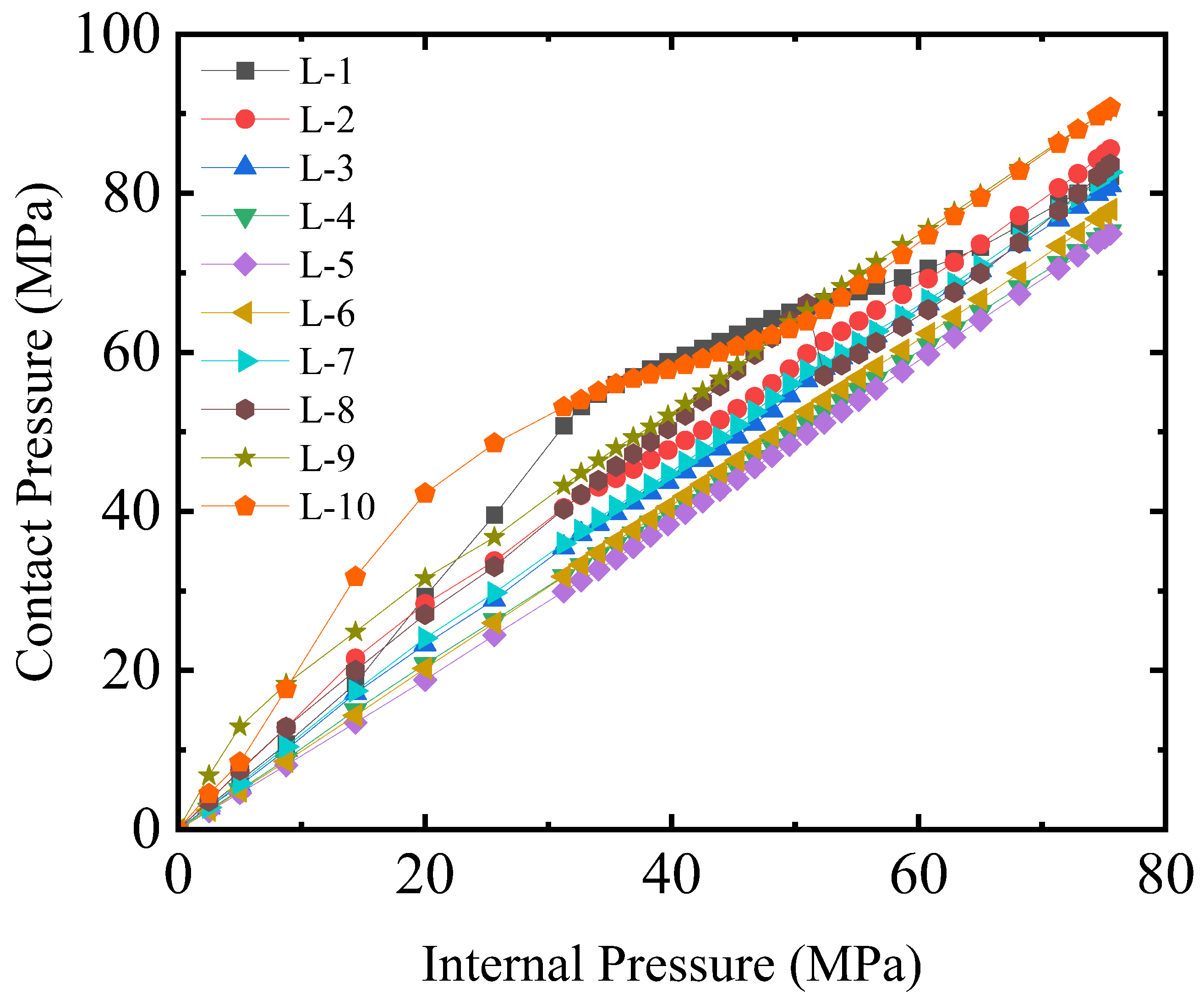 - Between the PA and the outer sheath, a rough tangential formulation was employed with hard normal contact, but separation after contact was not permitted. This constraint was necessary to mimic the physical role of the outer sheath in resisting radial expansion and providing continuous confinement to the PA layer during pressurisation.