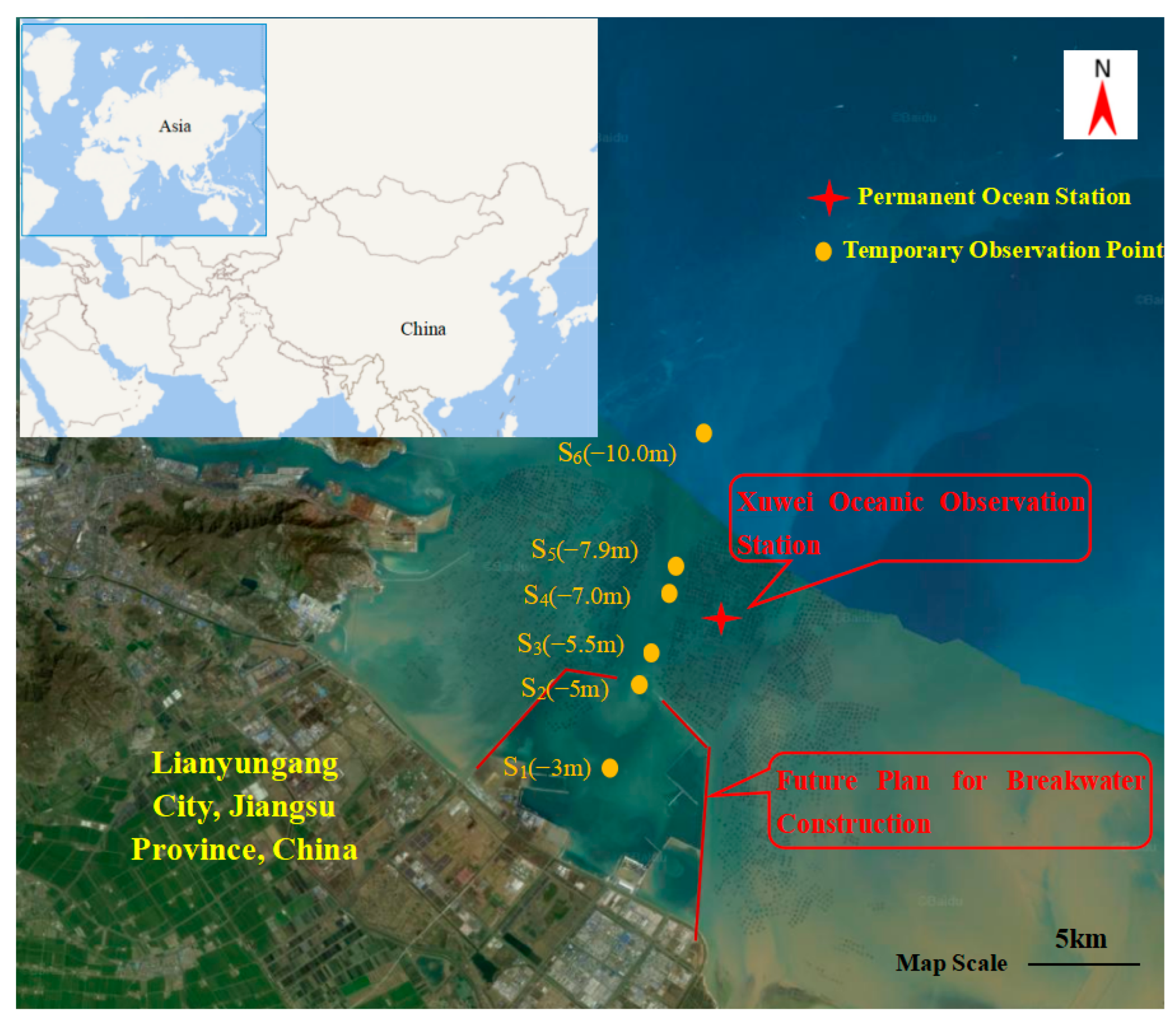 - Dong, H.; Lu, Z. Field Observation Results and Analysis of Waves, Tidal Currents, and Sediment in Lianyungang During a Cold Wave and Gale in December 2008; Tianjin Research Institute for Water Transport Engineering, Ministry of Communications: Tianjin, China, 2008. [Google Scholar]